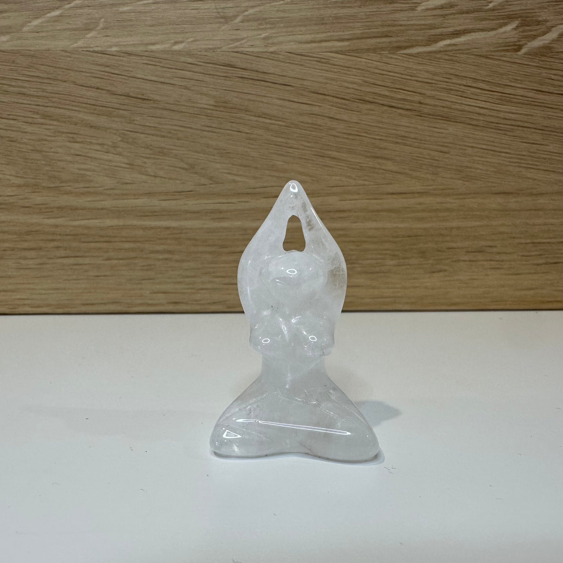 Denne Meditationsfigur i Bjergkrystal er en stærk symbolsk fremstilling af klarhed, renhed og åndelig forbindelse. Figuren forestiller en kvinde i en åben og modtagelig positur, hvor knæene er spredt ud til siden, og hænderne mødes over hovedet i en gestus af energetisk modtagelse og forening med det højere selv. Udskåret i ægte Bjergkrystal, forener figuren æstetisk skønhed med høj vibrationsenergi, og gør den til en kraftfuld støtte i både meditation og energiarbejde.