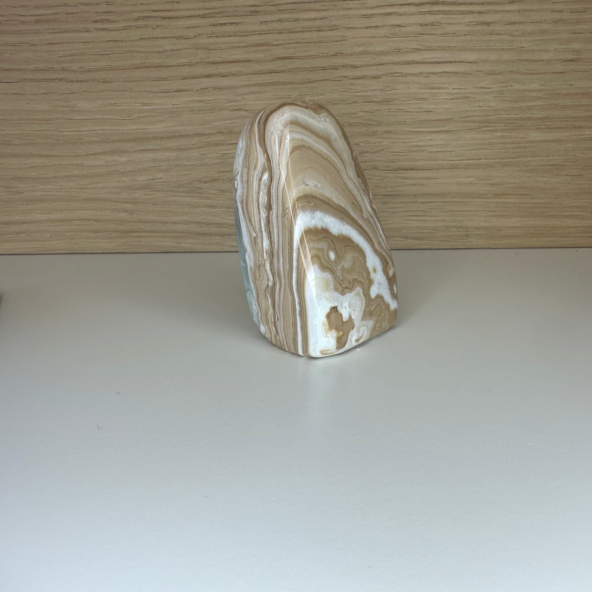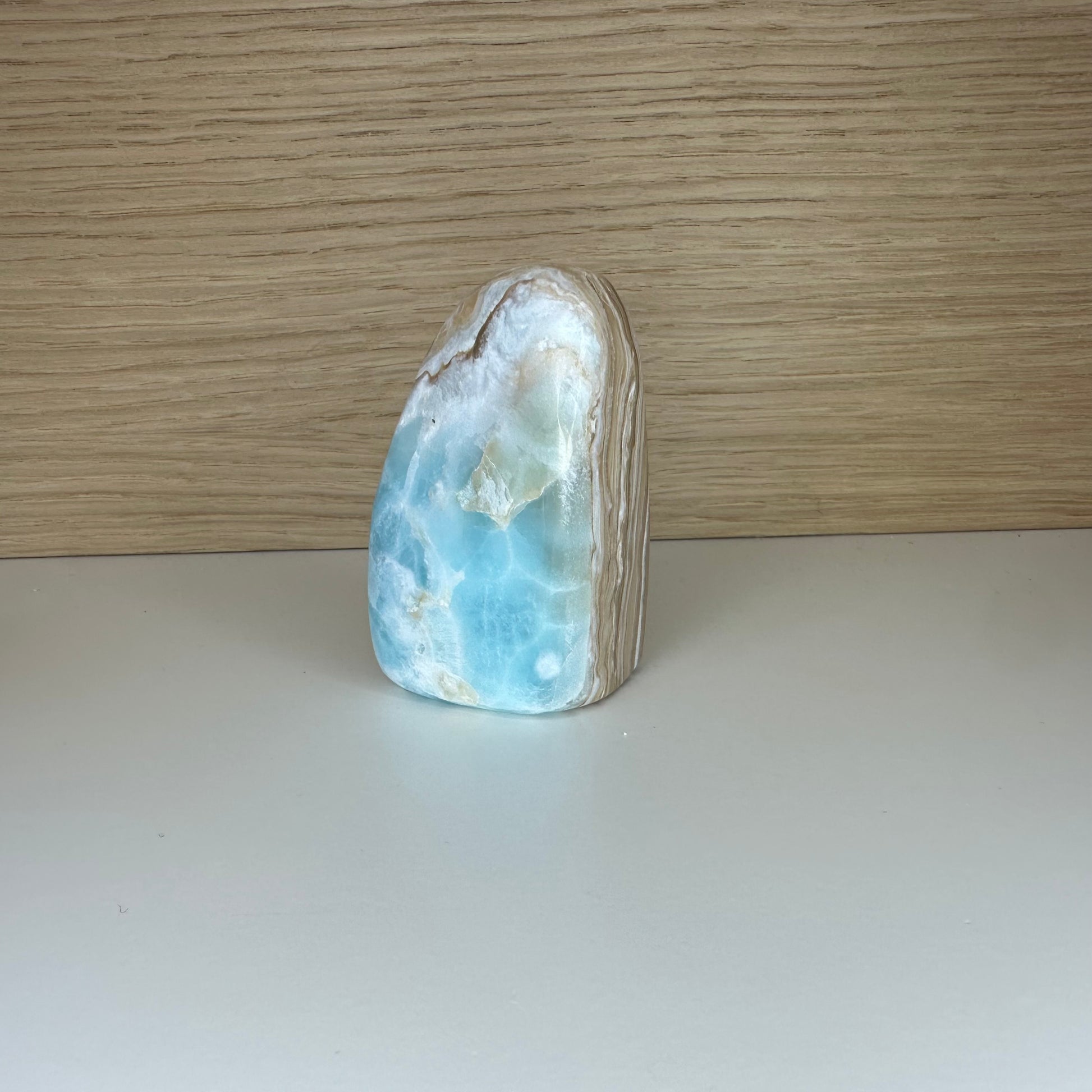Caribisk calcit er elsket for sine havblå og sandfarvede mønstre, som i freeform kommer til deres ret i bølgende, uforudsigelige former. Poleringen fremhæver stenens indre liv og variation, så du får et unikt stykke naturhistorie, formet med respekt for dets oprindelse.