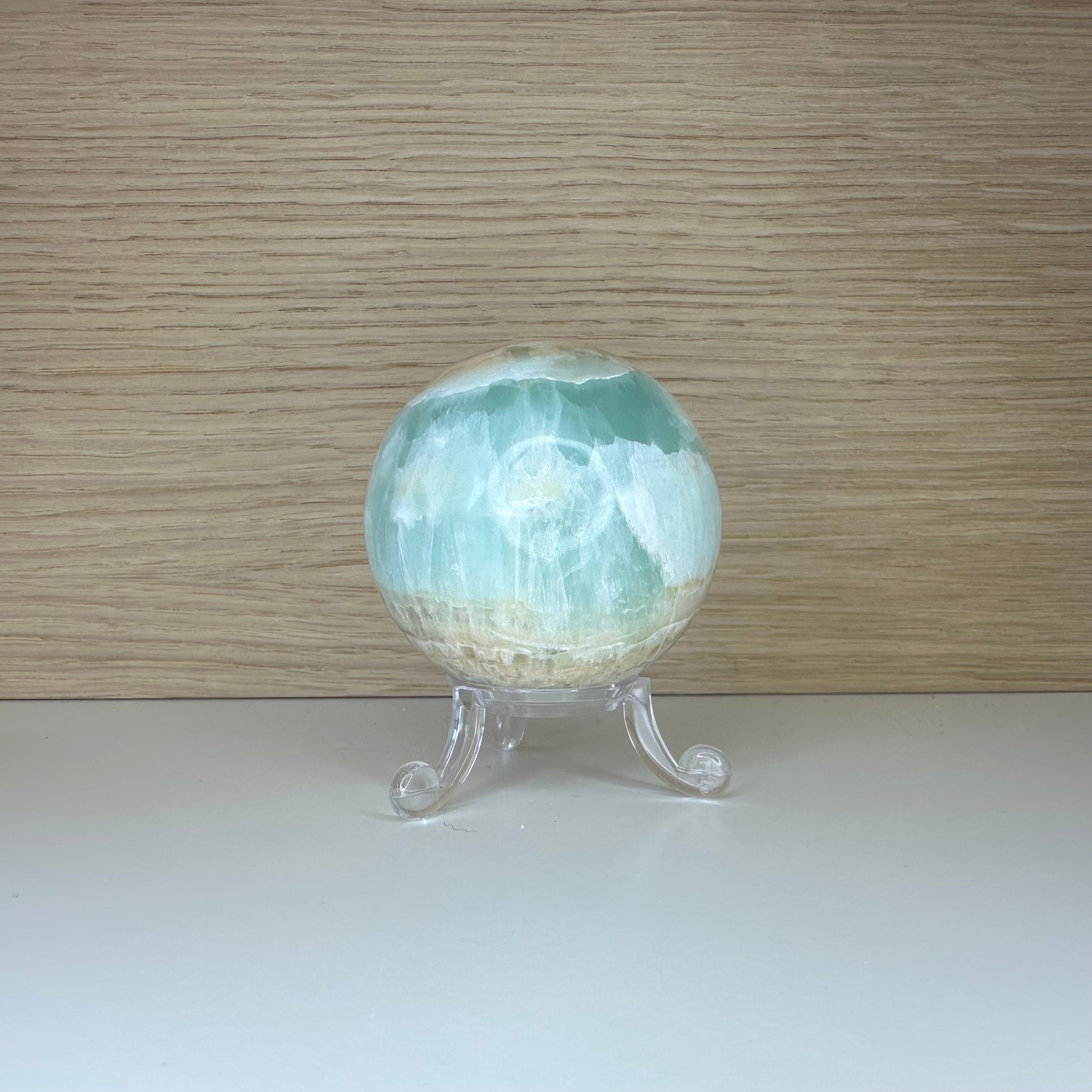 Kuglens glatte, polerede overflade fremhæver de bølgende blå og sandfarvede mønstre, som gør caribisk calcit så betagende. Hver kugle er et unikt kunstværk formet af naturens egne hænder – en fusion af himmel, hav og ørken i ét og samme udtryk.