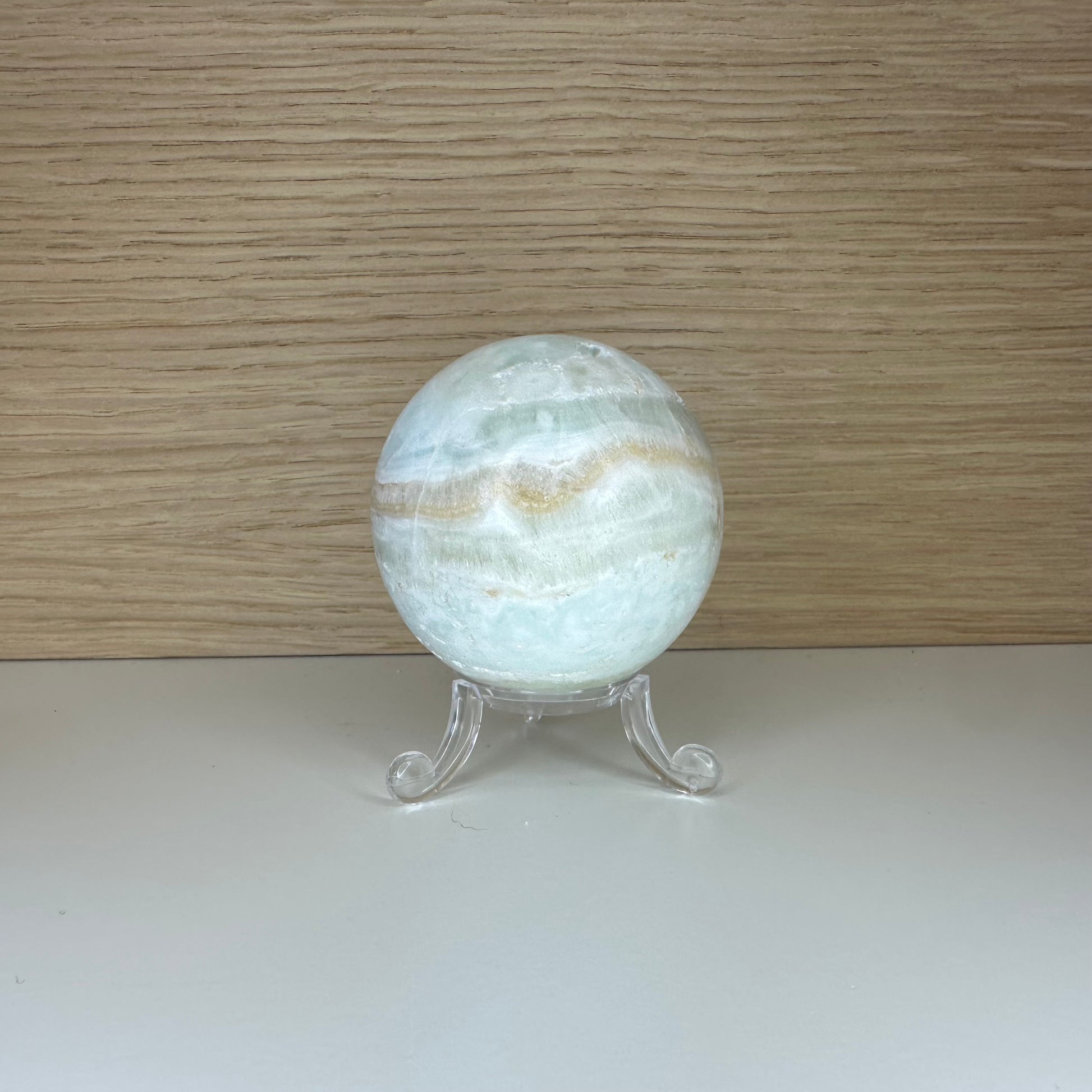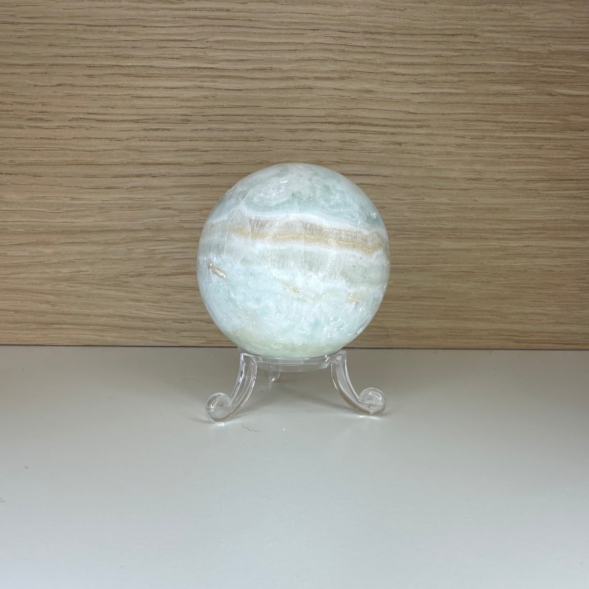 Kuglens glatte, polerede overflade fremhæver de bølgende blå og sandfarvede mønstre, som gør caribisk calcit så betagende. Hver kugle er et unikt kunstværk formet af naturens egne hænder – en fusion af himmel, hav og ørken i ét og samme udtryk.