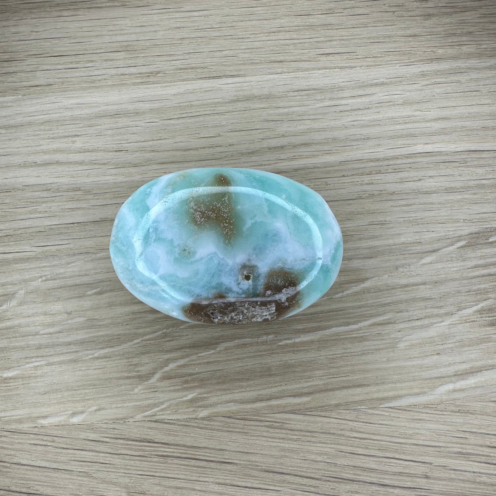 Farverne i caribisk calcit – fra lyseblå og hvid til karamel og sand – varierer blødt og flyder i bølgende mønstre. Hver palm stone er unik og bærer sin egen del af jordens historie. Den er ikke kun energetisk kraftfuld, men også visuelt betagende.