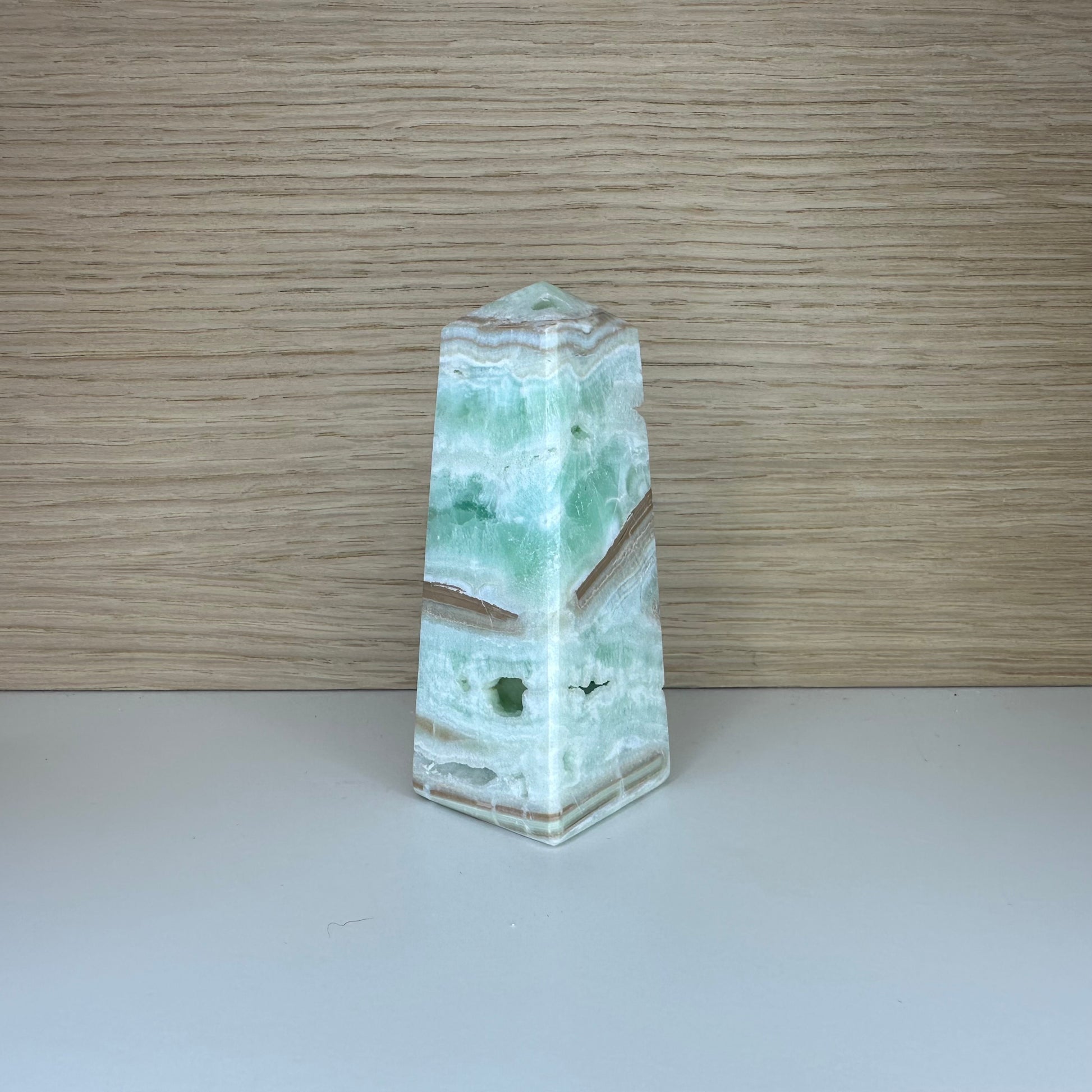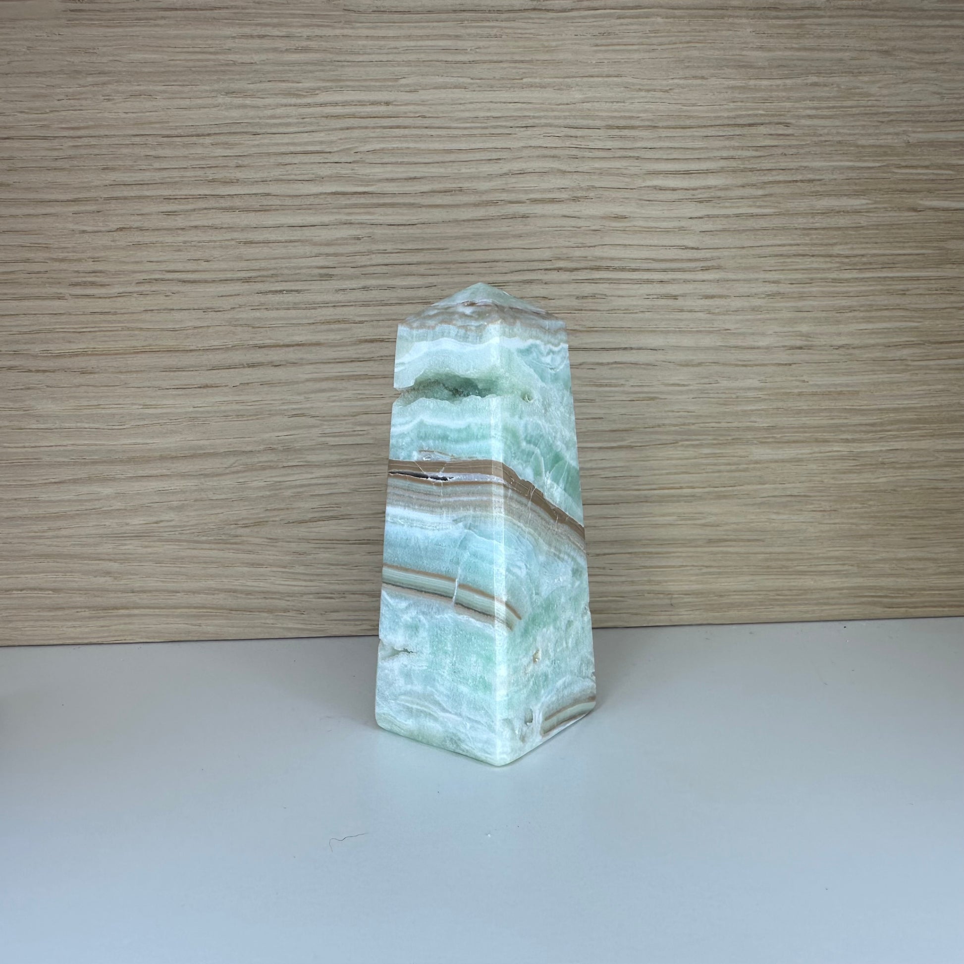Dette dragende Caribiske Calcit Tårn er ikke blot en krystal, men et stykke af jordens sjældne historie. Med sine havblå, hvide og sandfarvede lag vækker det minder om fredelige kystlandskaber og klar himmel. Stenen er kendt for sin beroligende energi og sin evne til at styrke intuition og indre refleksion.