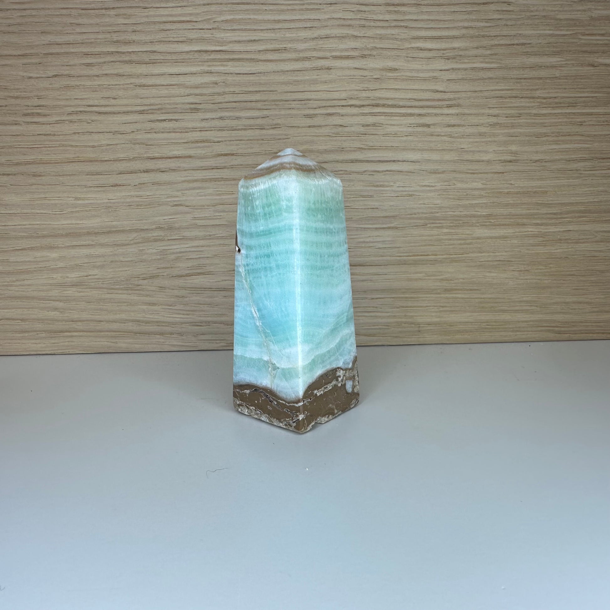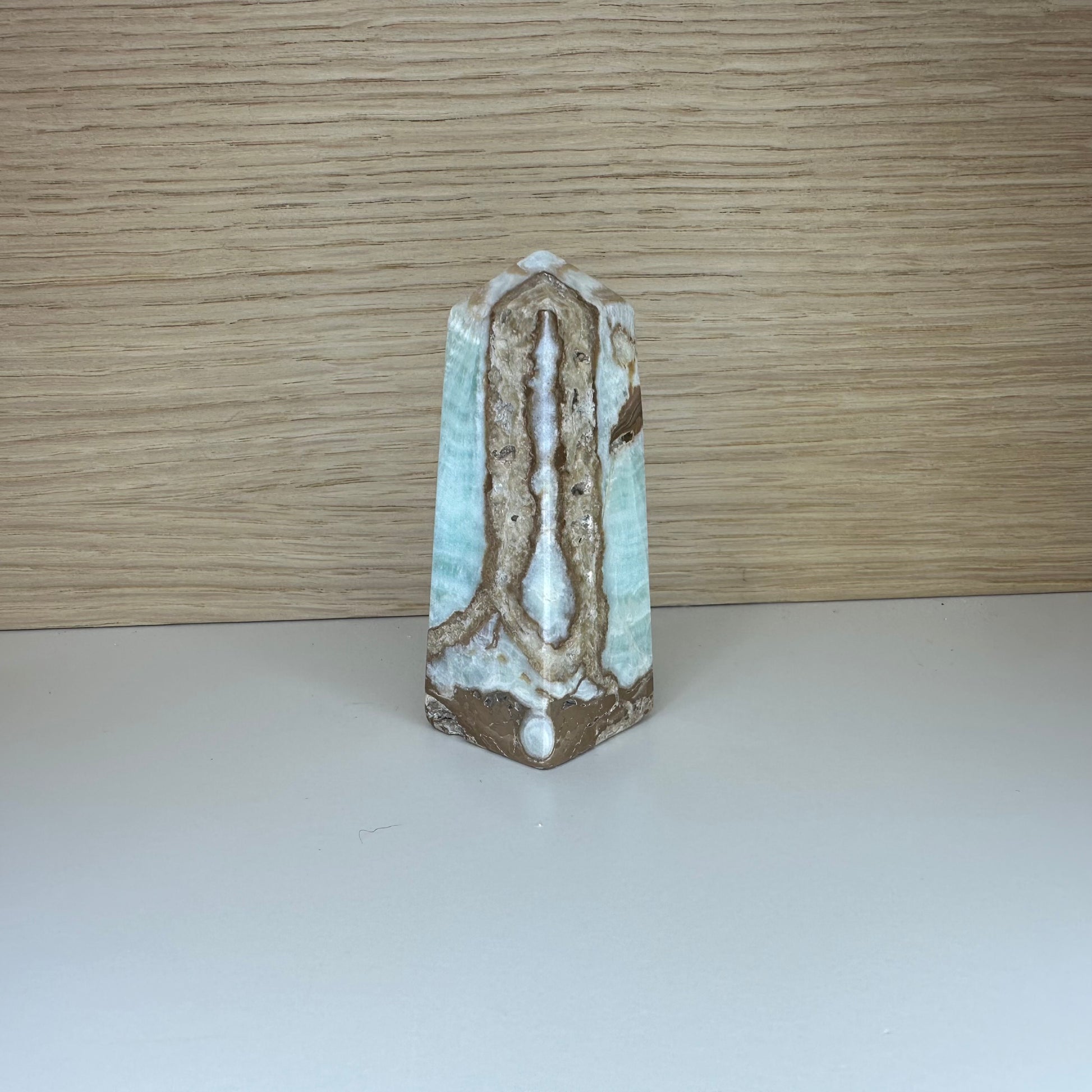 Caribisk calcit blev først opdaget i 2019 i Balochistan-regionen i det sydvestlige Pakistan og findes udelukkende dér. Denne kombination af blå calcit og brun aragonit opstod naturligt over millioner af år under særlige geologiske forhold, som ikke findes andre steder på jorden. Det gør stenen ekstremt sjælden – og endnu mere bemærkelsesværdigt er det, at forekomsten allerede er ved at være udtømt. Når den nuværende kilde er opbrugt, vil der ikke kunne udvindes mere caribisk calcit, hvilket gør hvert enkelt tårn til en sand samlergenstand.