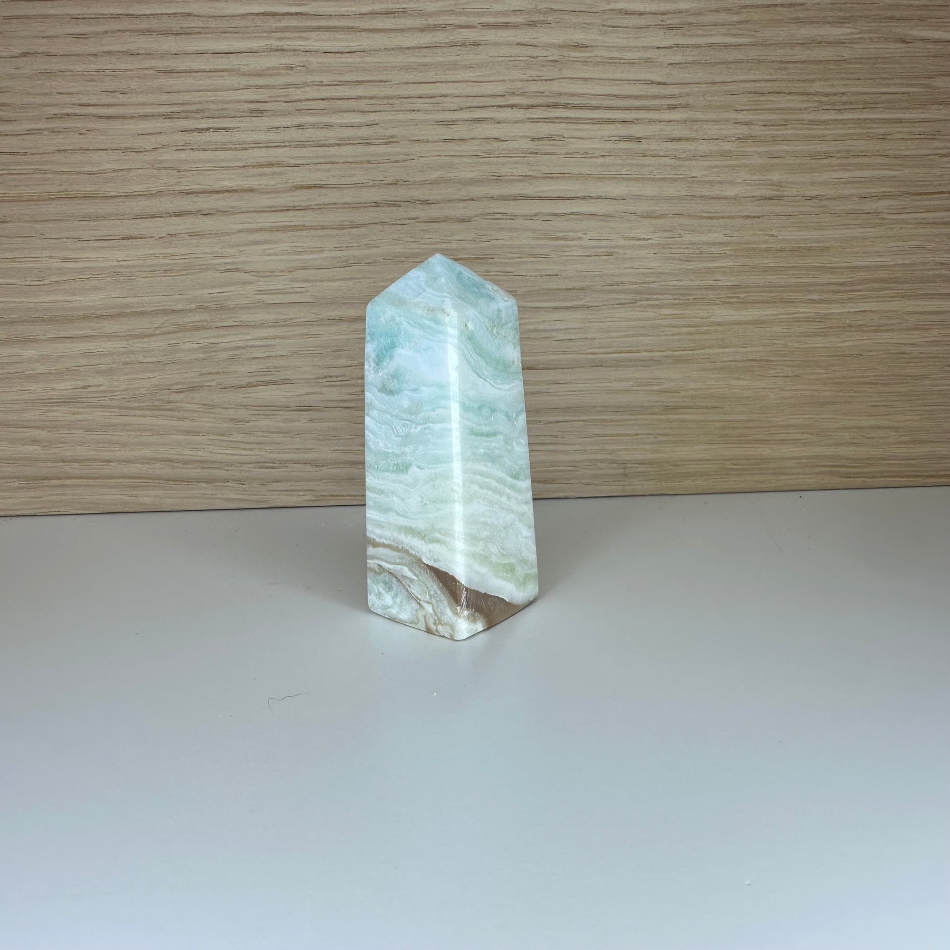 Dette dragende Caribiske Calcit Tårn er ikke blot en krystal, men et stykke af jordens sjældne historie. Med sine havblå, hvide og sandfarvede lag vækker det minder om fredelige kystlandskaber og klar himmel. Stenen er kendt for sin beroligende energi og sin evne til at styrke intuition og indre refleksion.