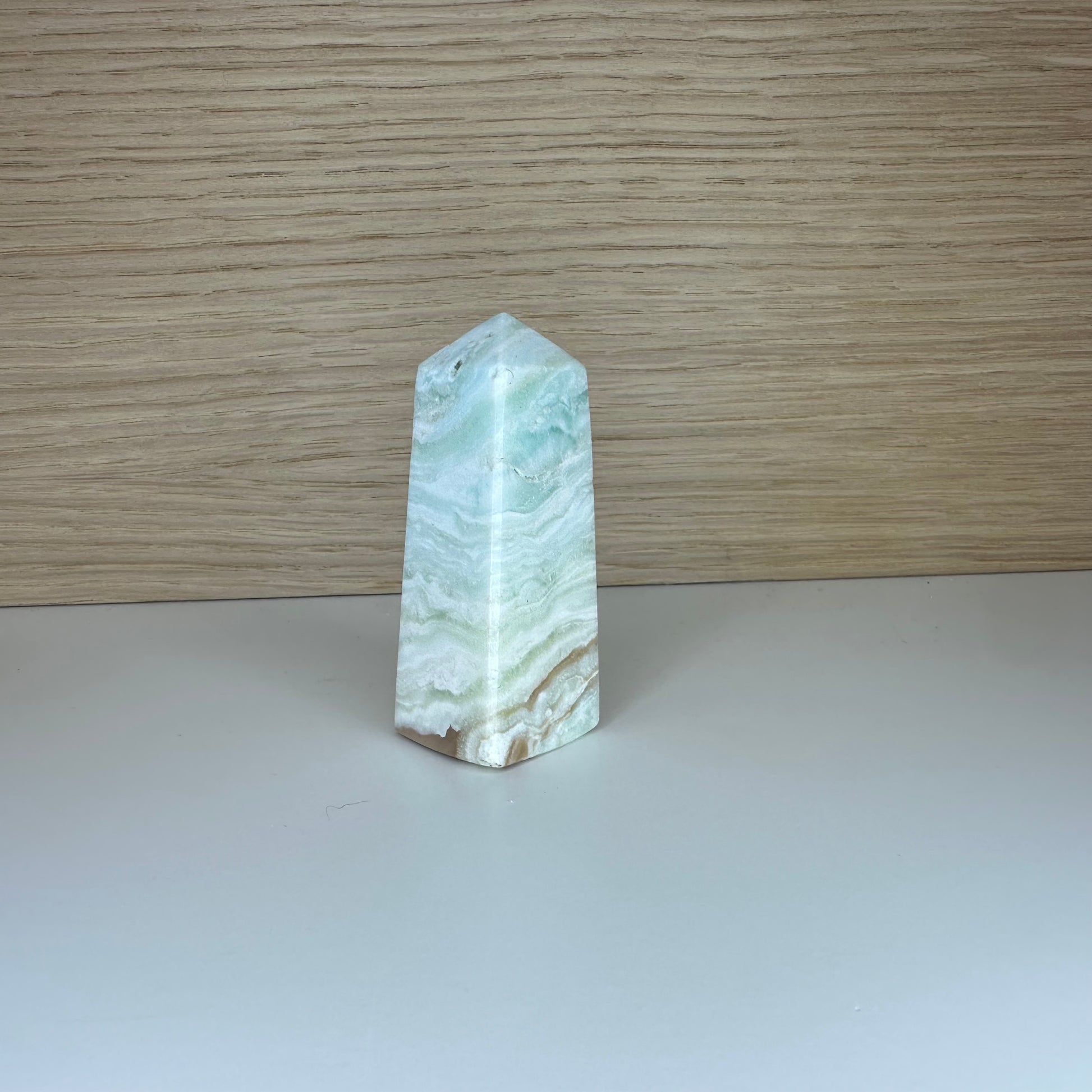 De bølgende mønstre i blå, creme og sandfarve gør hvert tårn til et ægte naturkunstværk. Der findes ikke to, der er ens – hvert stykke er formet af jorden selv og bærer sin egen unikke æstetik og energi.