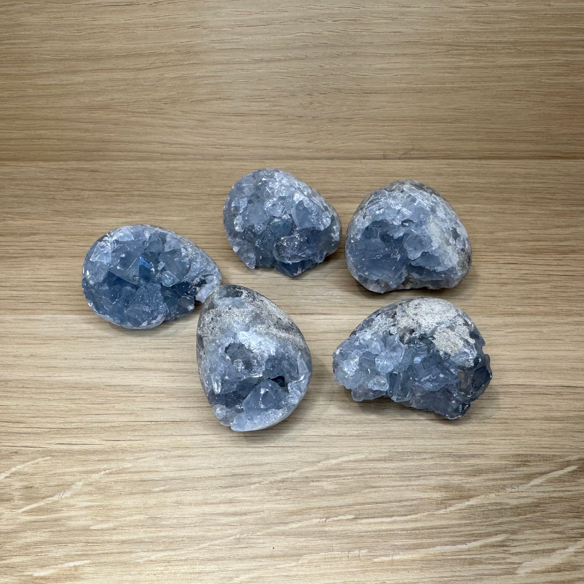 Bemærk: Celestit er en skrøbelig natursten og bør håndteres med forsigtighed. Hvert stykke varierer i form, farvetone og krystalstruktur – det er netop dét, der gør dem unikke.