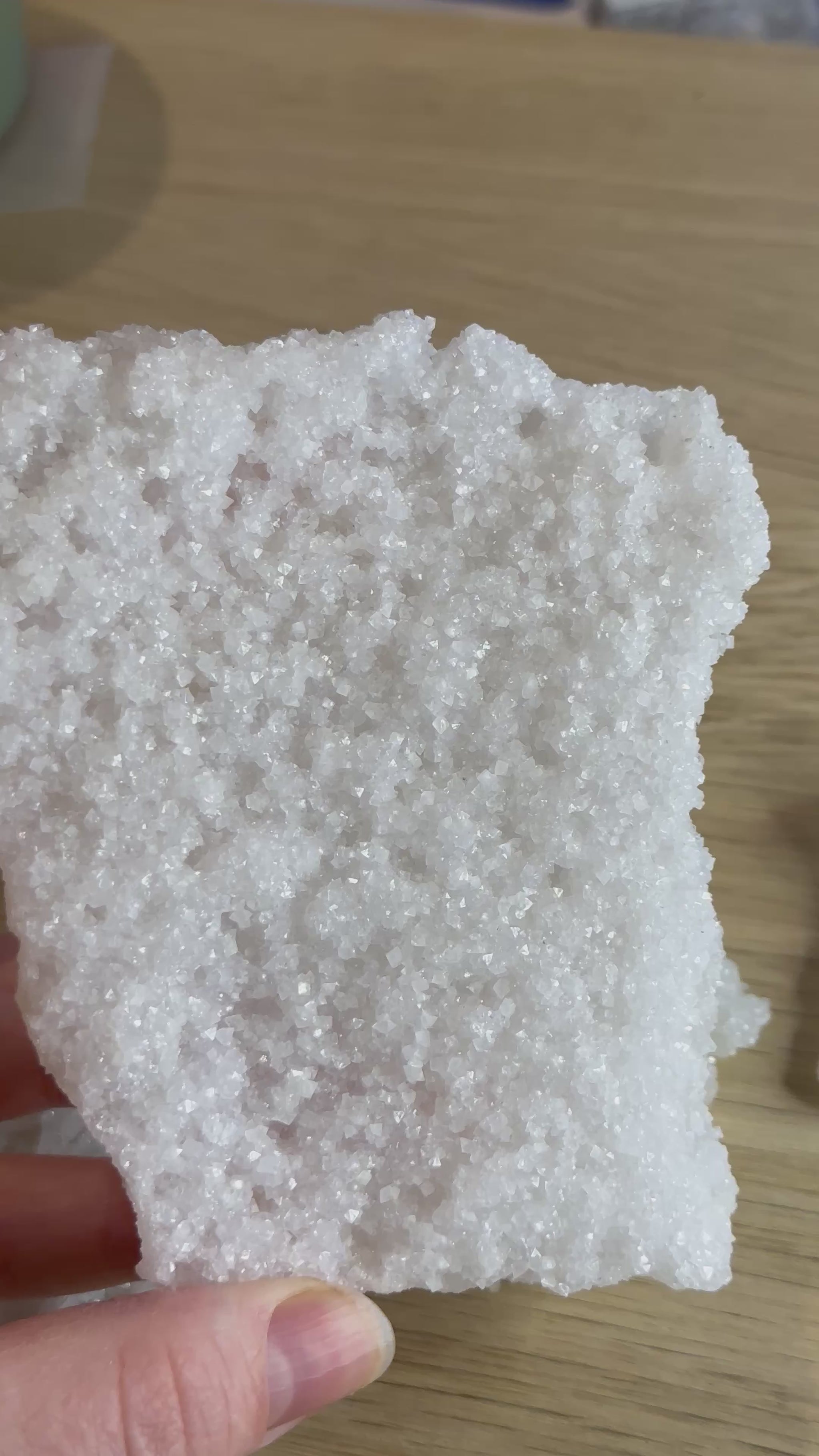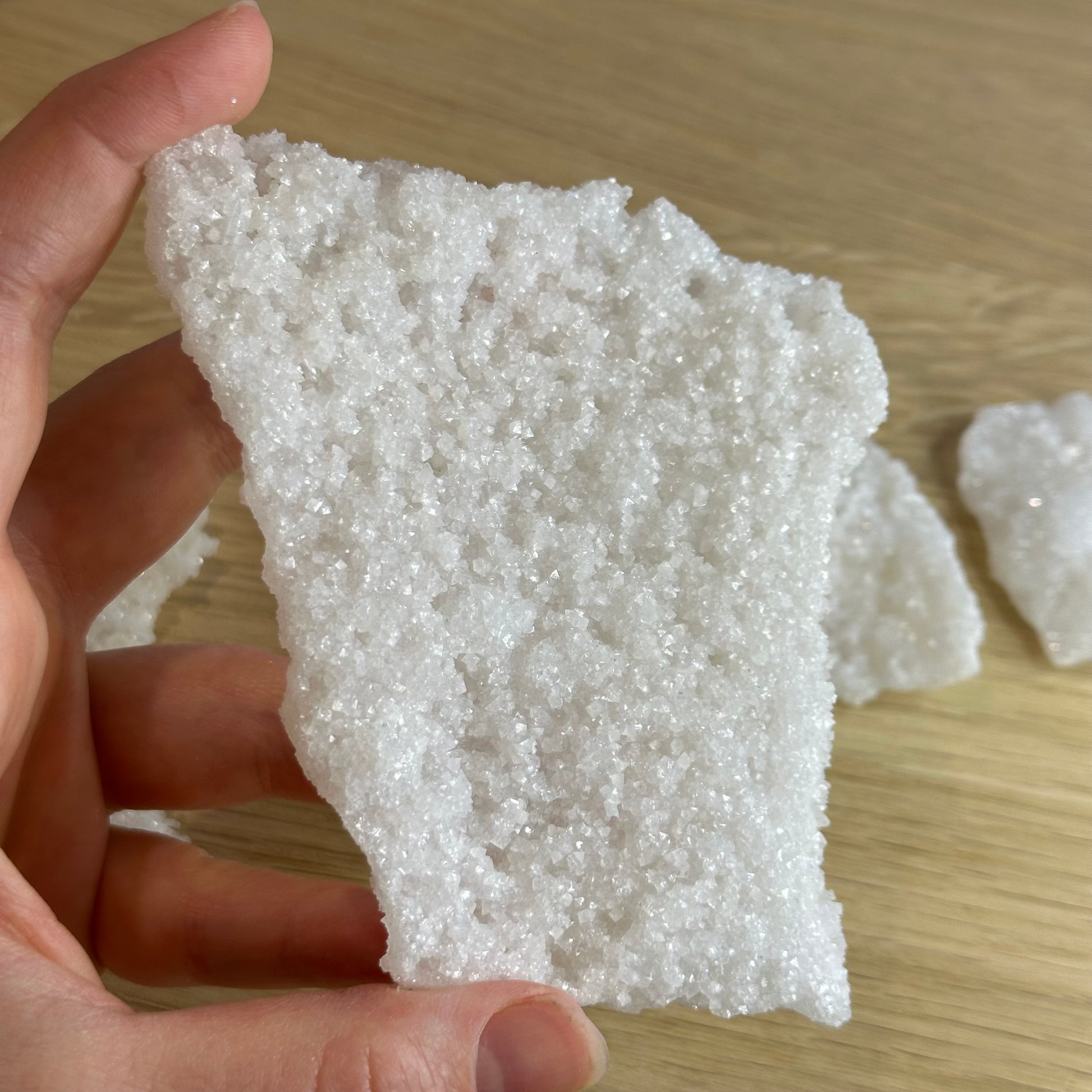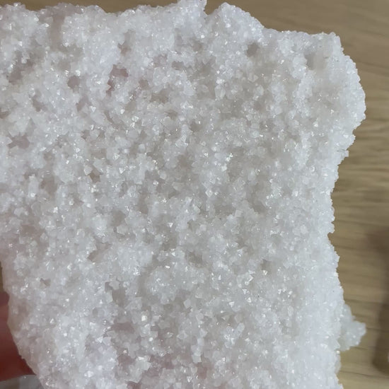 Diamanté Apophyllite har en naturlig, glitrende overflade med en ædelstenslignende glans. Den delikate druse af mikrokrystaller giver et næsten “diamantstøv”-udtryk, hvor hver refleksion fanger lyset på magisk vis. Farven er ren hvid med let gennemsigtighed og enkelte skinnende facetter, som får stenen til at fremstå levende og lysende.