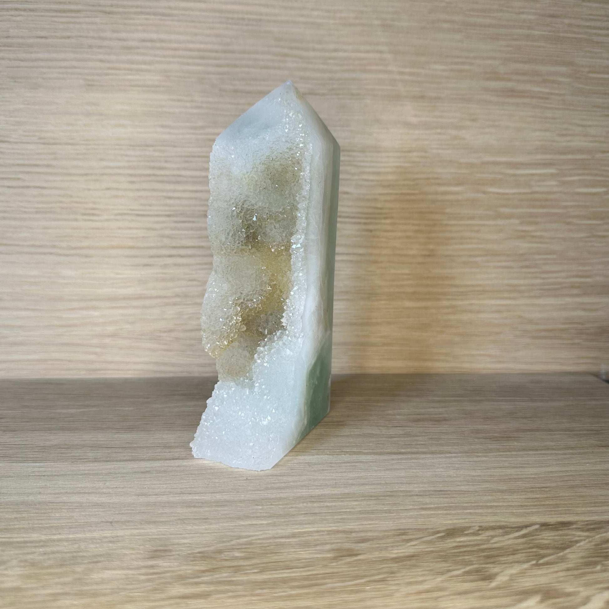 Druzy + poleret kraft: Den druzy-dækkede side udsender en let og vibrerende energi, der forstærker omgivelserne med sit funklende skær. Den polerede side fungerer som et ankerpunkt for intention og bevidsthed. Kombinationen gør dette tårn ideelt til både energetisk arbejde og som en visuel, energetisk juvel i dit hjem.