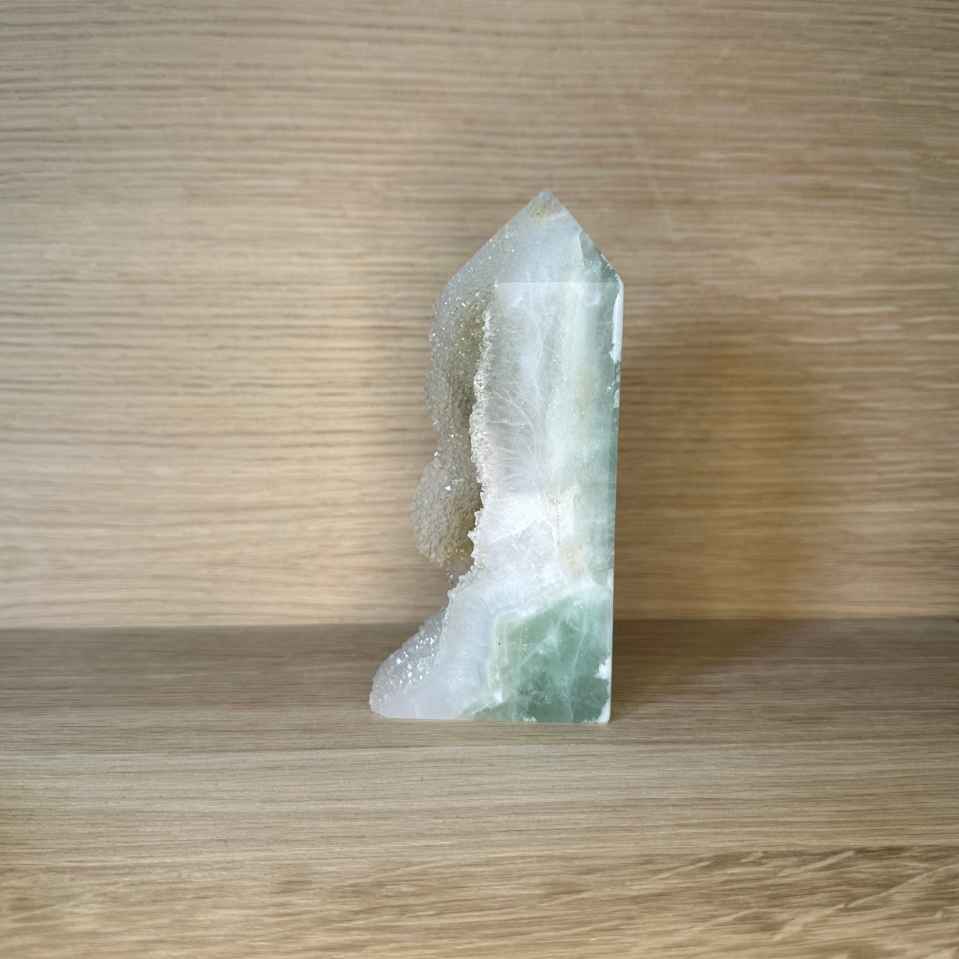 Dette lysende Mega Druzy Fluorit Tårn er et betagende og energifyldt stykke, der forener naturens rå skønhed med krystallens rensende kraft. Den ene halvdel er dækket af naturlige, glitrende druzykrystaller, mens den anden er sirligt poleret og fremhæver fluoritens lysegrønne, beroligende farve. Tårnet balancerer mellem det rå og det raffinerede – et perfekt symbol på indre harmoni og transformation.
