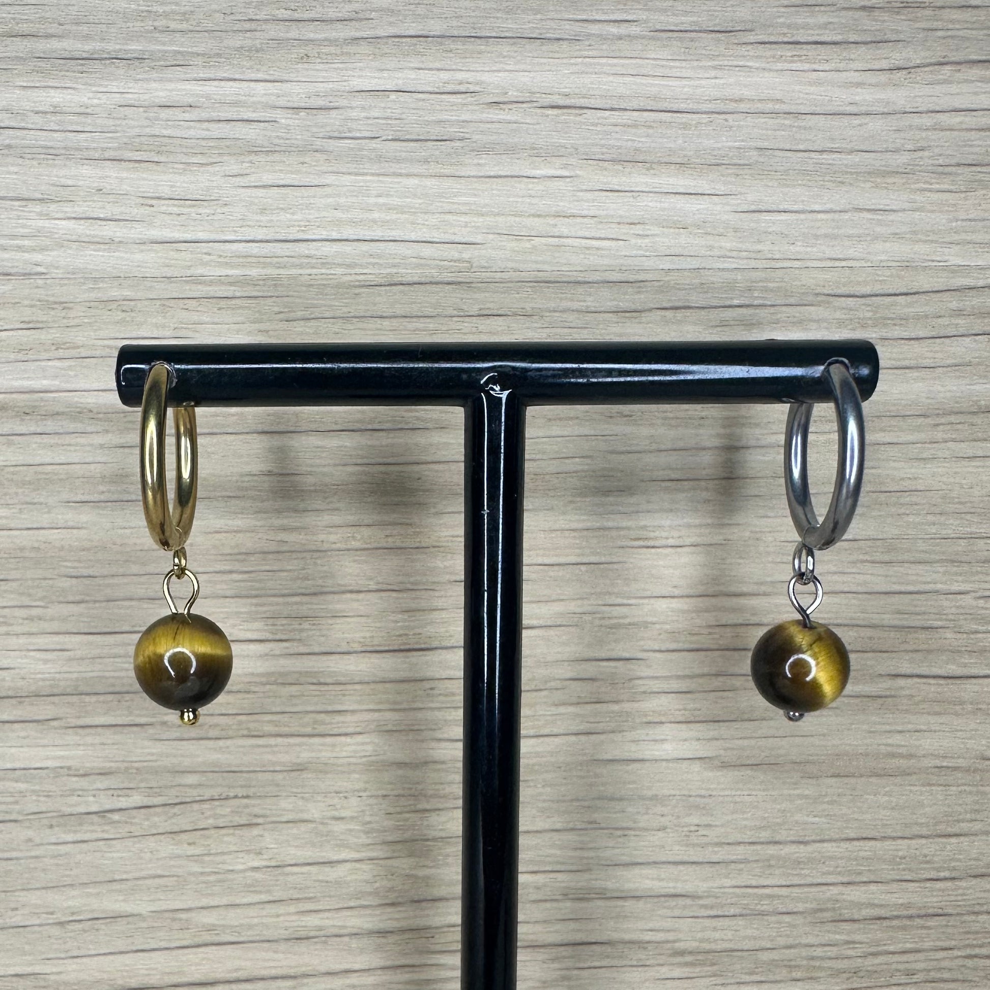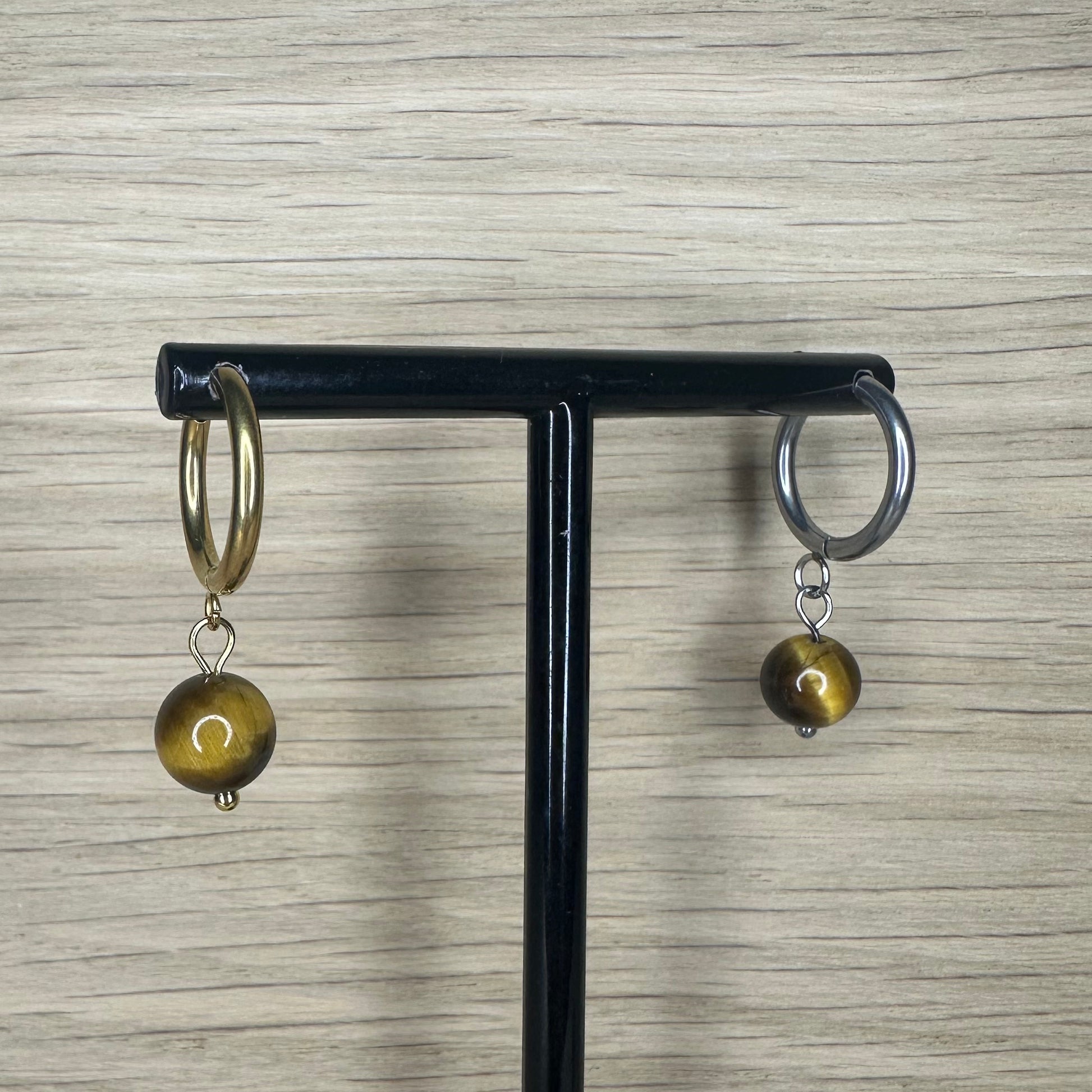 Disse håndlavede hoops er designet med én smuk, ægte tigerøje krystalperle på 8 mm. Den varme gyldne-brune nuance med naturlige striber giver et elegant og levende udtryk, der tilfører dybde og karakter til både hverdags- og festlooks.