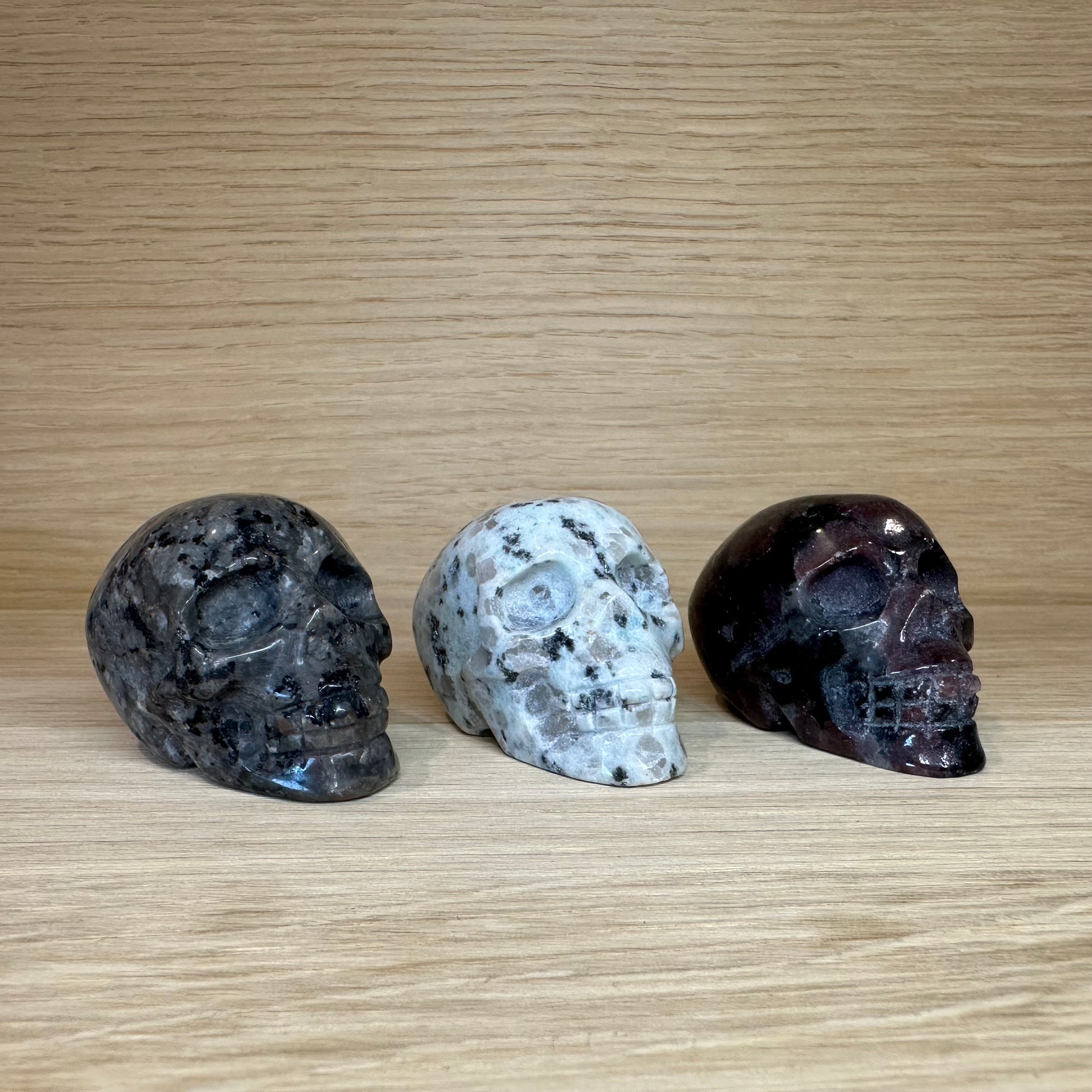 Bemærk: Stenene er natursten, og farve, glans og mønster varierer fra figur til figur. Hvert kranie er derfor unikt både visuelt og energetisk.