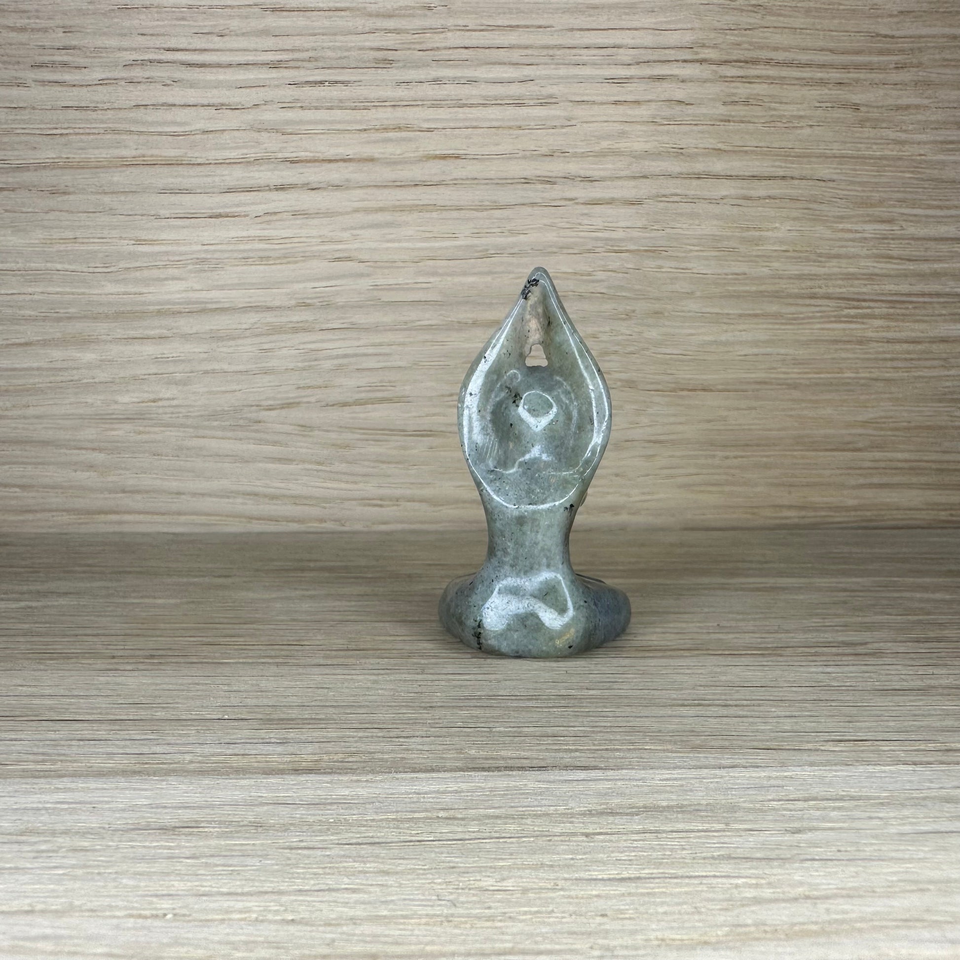 Denne Meditationsfigur i Labradorit er en kraftfuld ledsager i spirituelt arbejde, indre transformation og intuitiv fordybelse. Figuren forestiller en kvinde i en åben og modtagelig meditationsstilling – med knæene ud til siden og hænderne samlet over hovedet i en gestus, der symboliserer taknemmelighed, balance og forbindelse til det højere selv. Udført i den magiske og beskyttende Labradorit bringer figuren både dybde, indsigt og mystik til dit rum og din praksis.