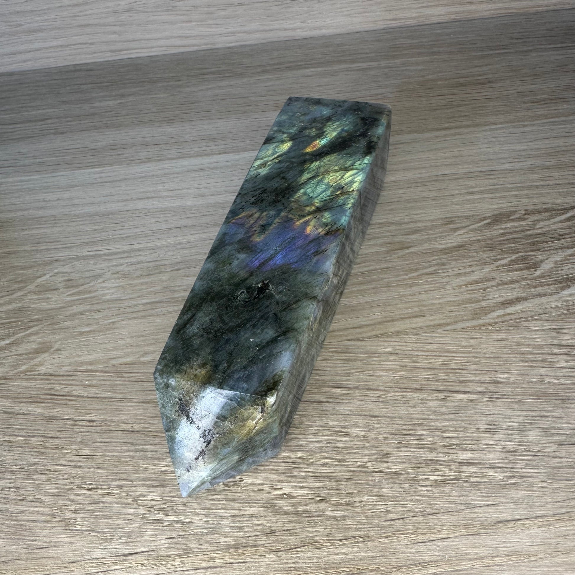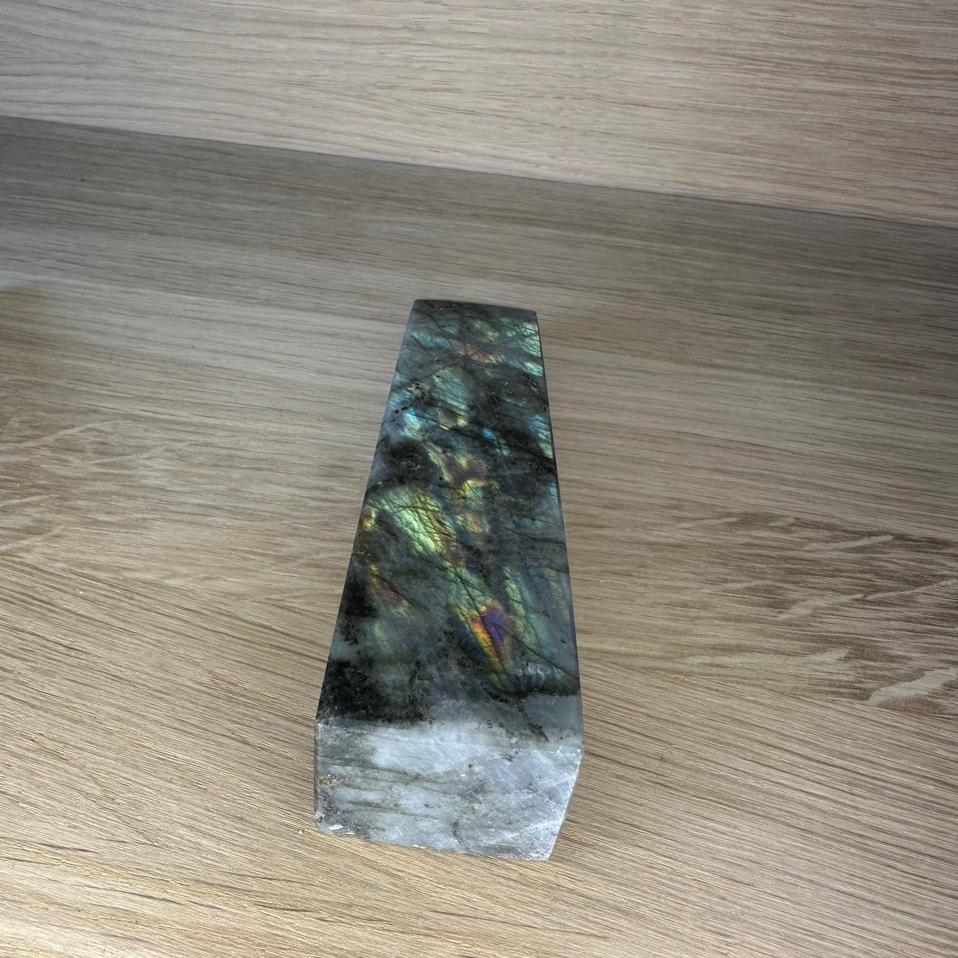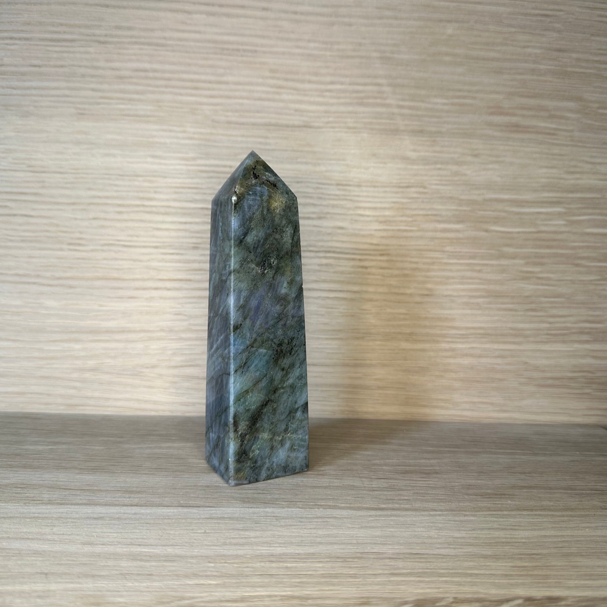 Du køber præcis det tårn, der vises på billedet. Labradorit er en naturlig krystal, og hver enkelt har sit helt unikke farvespil og karakter – dette stykke er én af en slags.