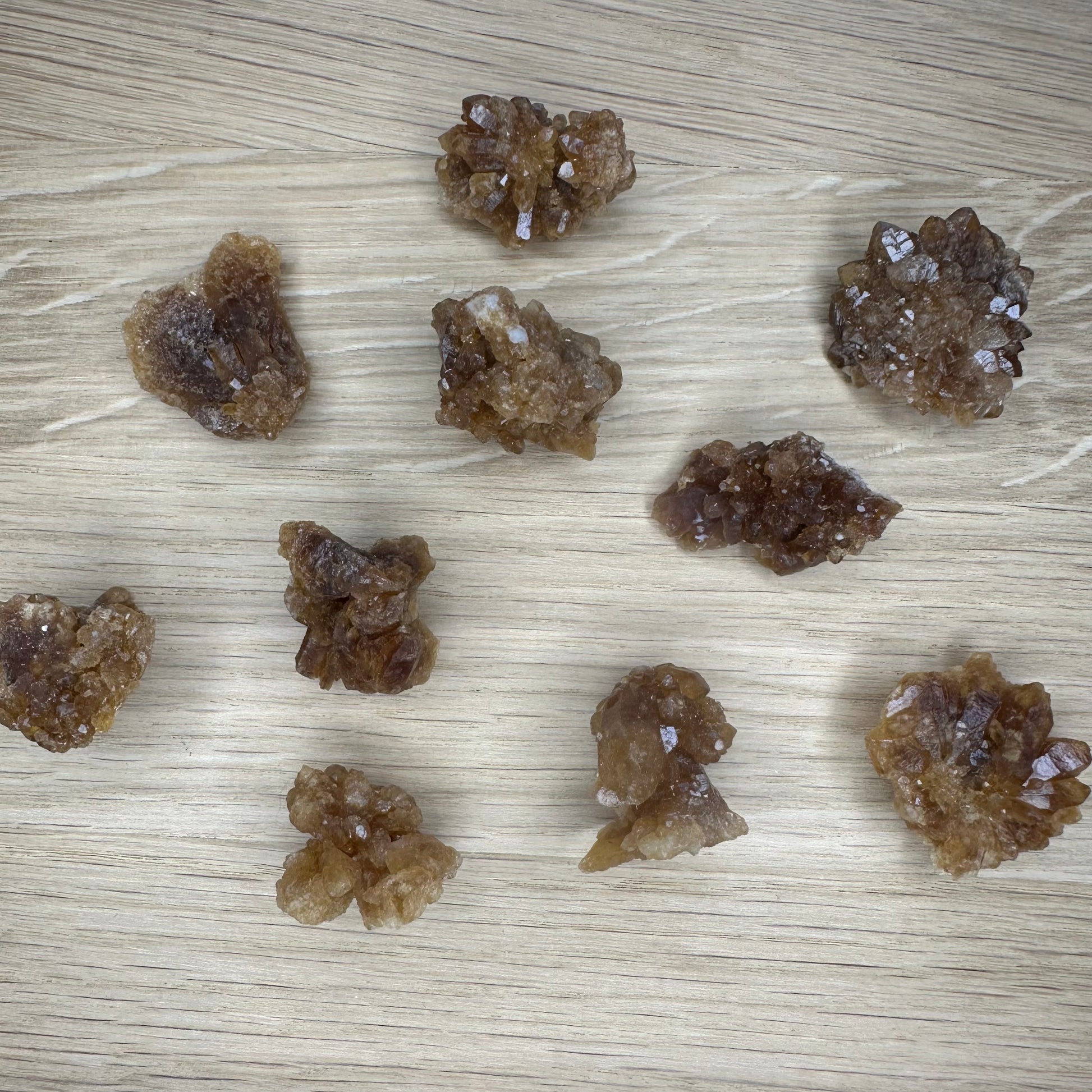 Disse sjældne og betagende Marokko Citrin Pseudomorfer er et vidnesbyrd om naturens egen alkymi – en fuldstændig forvandling fra ét mineral til et andet. Hver sten begyndte som en ikaitekrystal, men er over tid blevet erstattet af ren, naturlig citrin, mens den oprindelige form er bevaret som et naturligt mirakel.