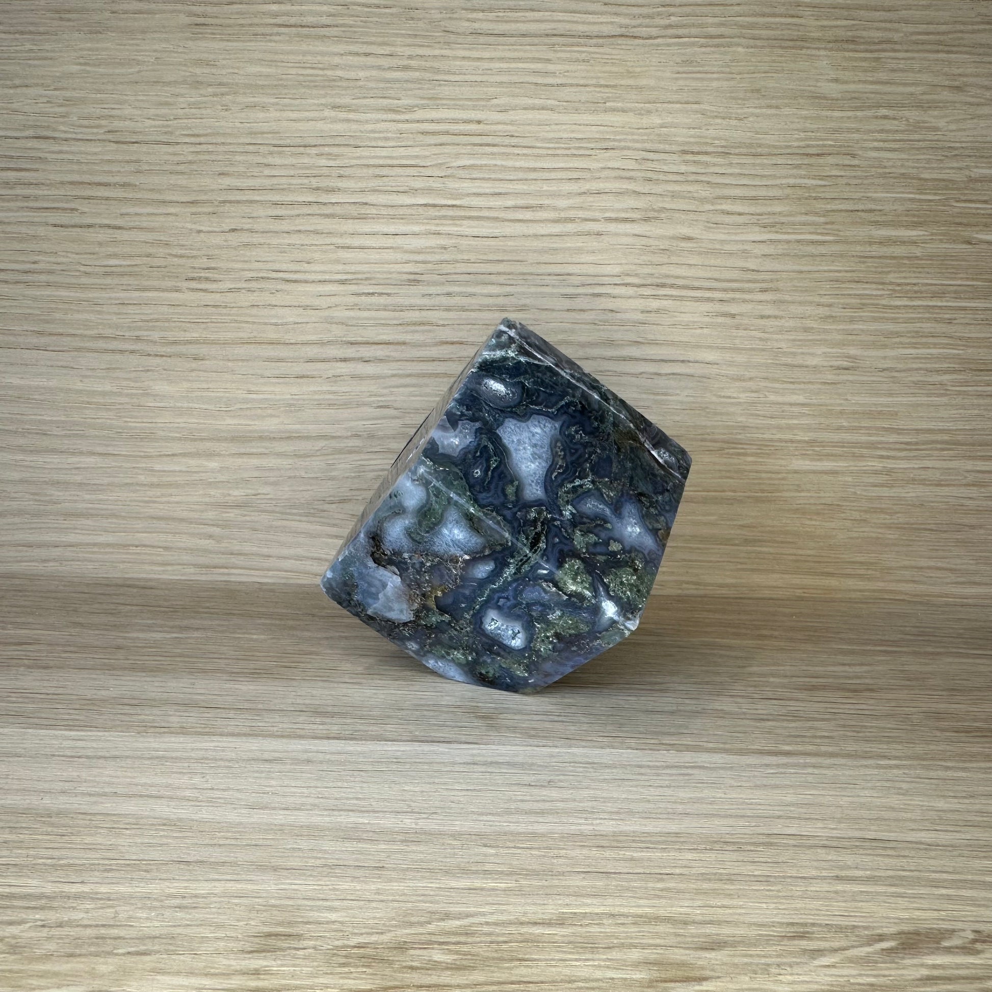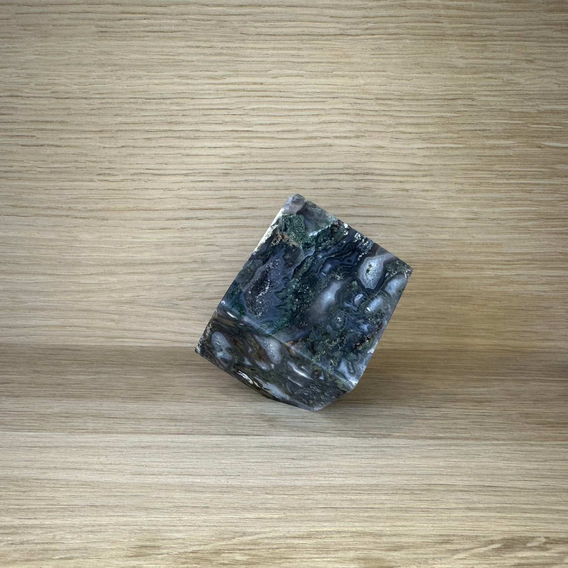 Denne polerede Mos Agat Terning forener blød elegance med naturens rå autencitet. Selvom den er glatpoleret, bærer den små fejl og naturlige ujævnheder – som små ar fra sin rejse gennem jorden. Det gør den til et unikt, karakterfuldt stykke, der minder os om, at skønhed ikke handler om perfektion, men om ægthed.