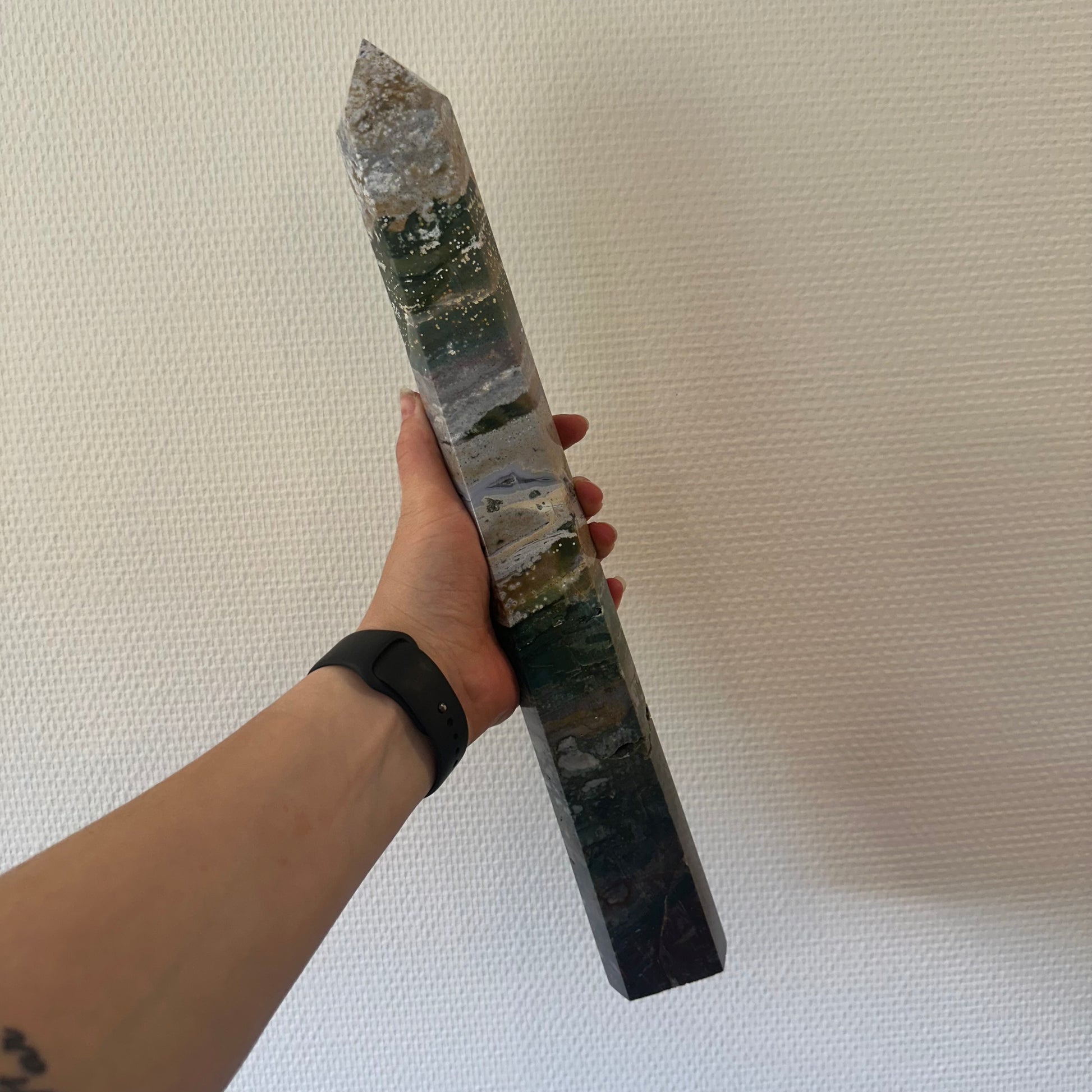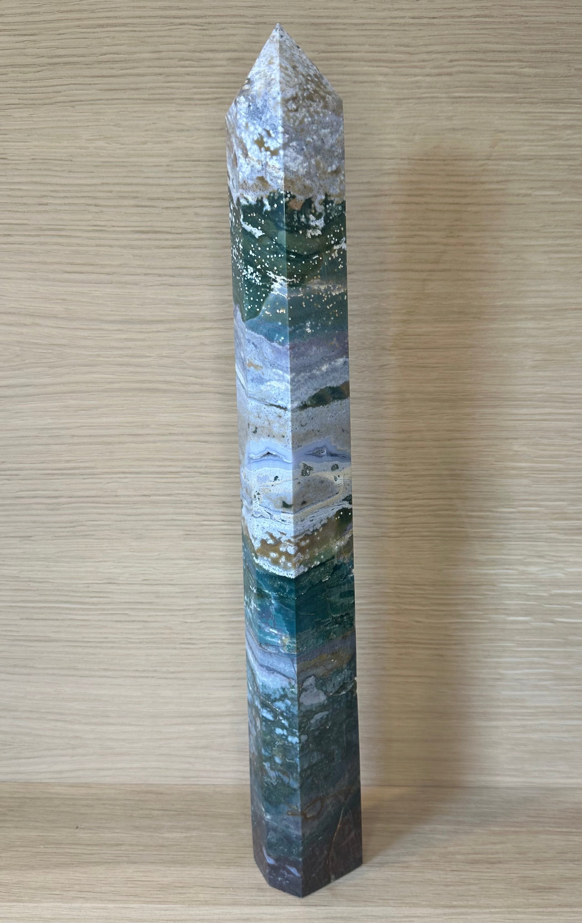 Dette majestætiske Ocean Jaspis Tårn er et sjældent og storslået stykke naturkunst – hele 40,5 cm højt og vejer imponerende 1835 gram. Et kraftfuldt og dybt healende krystal, der bringer både indre ro og livsglæde. Ocean Jaspis er kendt som “glædens sten” og bærer havets nærende energi med sig – blød, bølgende og uendeligt støttende.