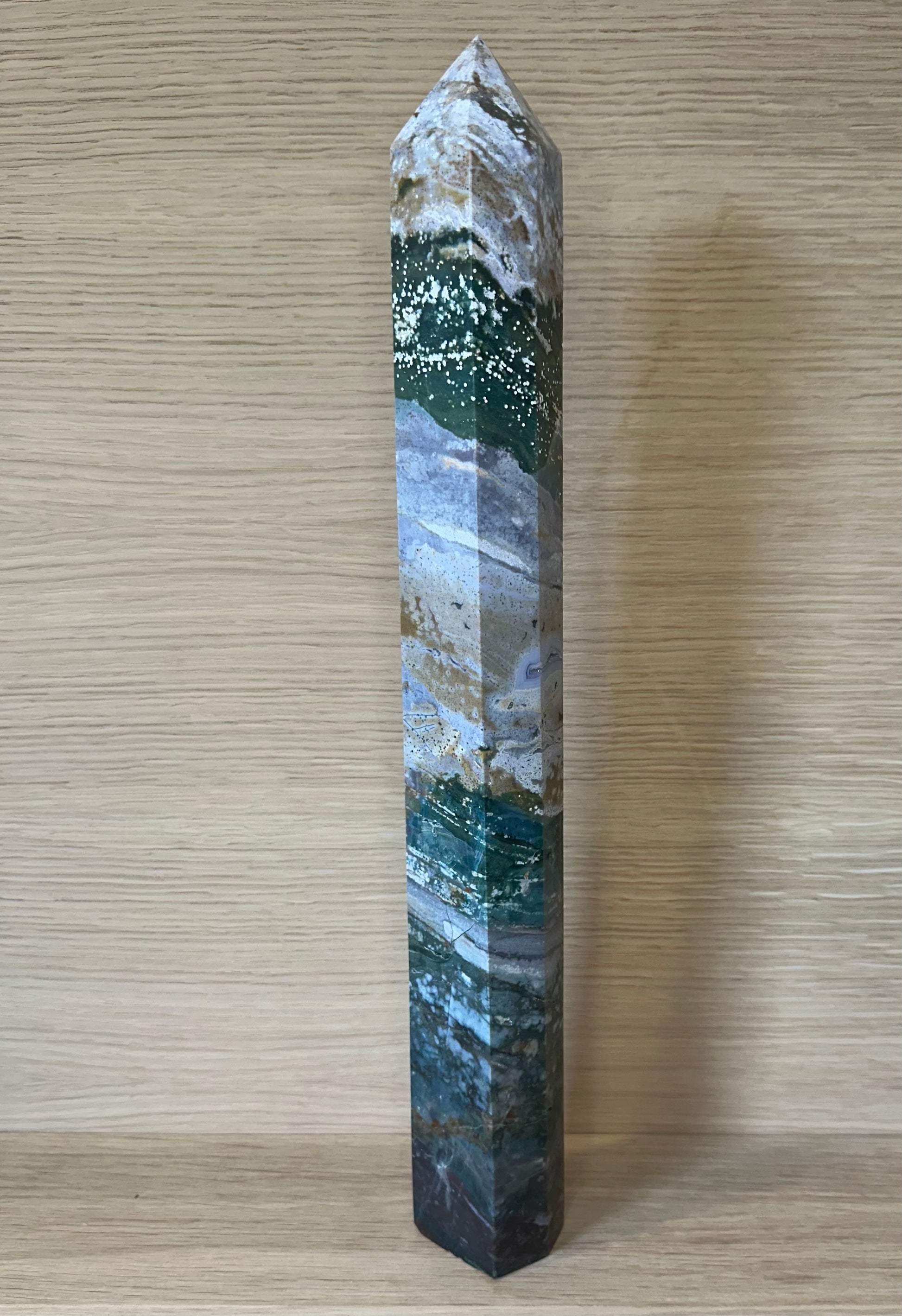 Du køber netop det tårn, du ser på billedet. Ocean Jaspis varierer smukt i farve og mønster – og dette eksemplar er udvalgt for sin enestående størrelse, kraft og skønhed.