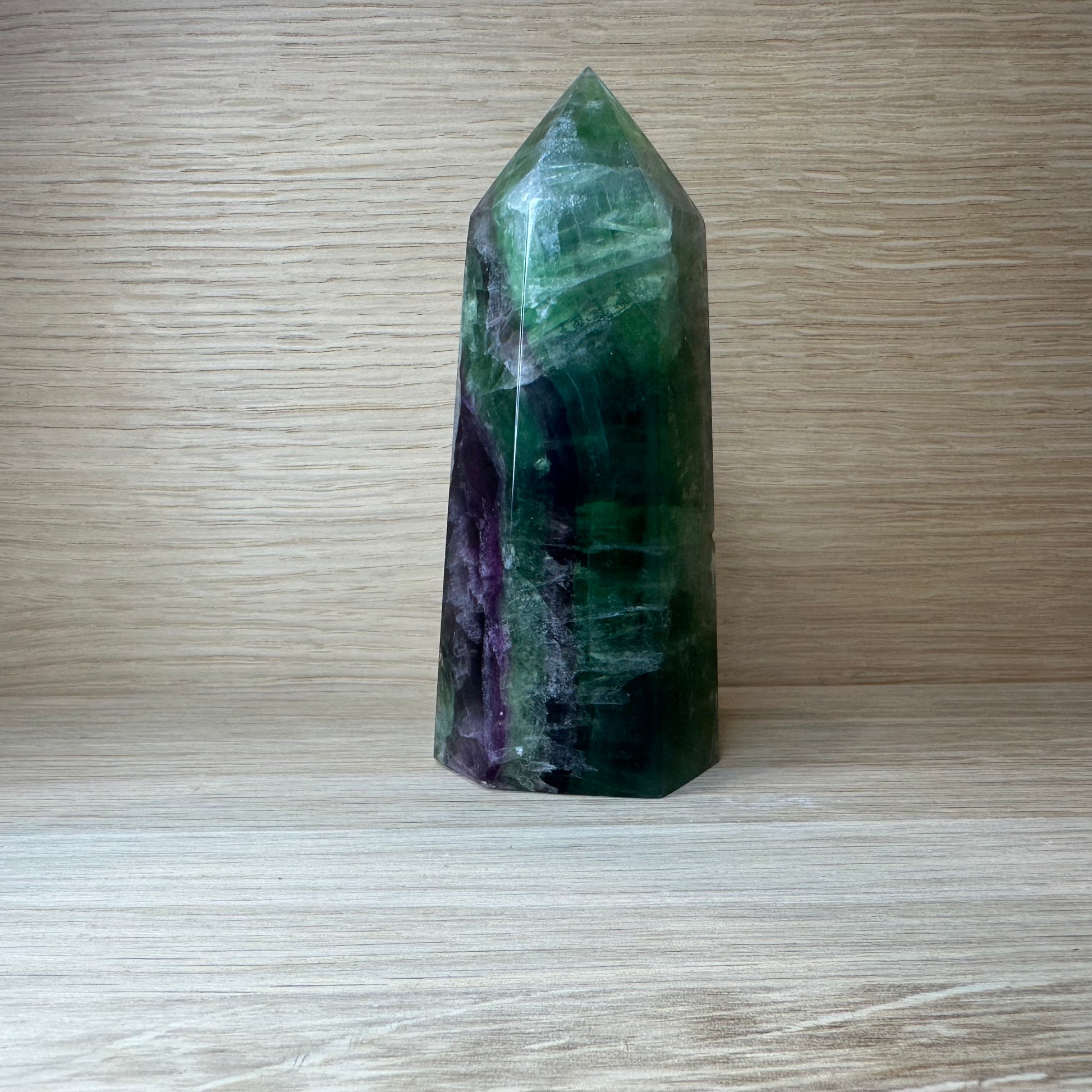 Tårnet viser smukke, naturlige bånd i grønne, lilla og gennemsigtige nuancer. Hvert lag repræsenterer en ny dimension af energi, og det polerede udtryk fremhæver stenens dybde og farvespil. Intet tårn er ens – hvert stykke er et unikt naturvidunder.