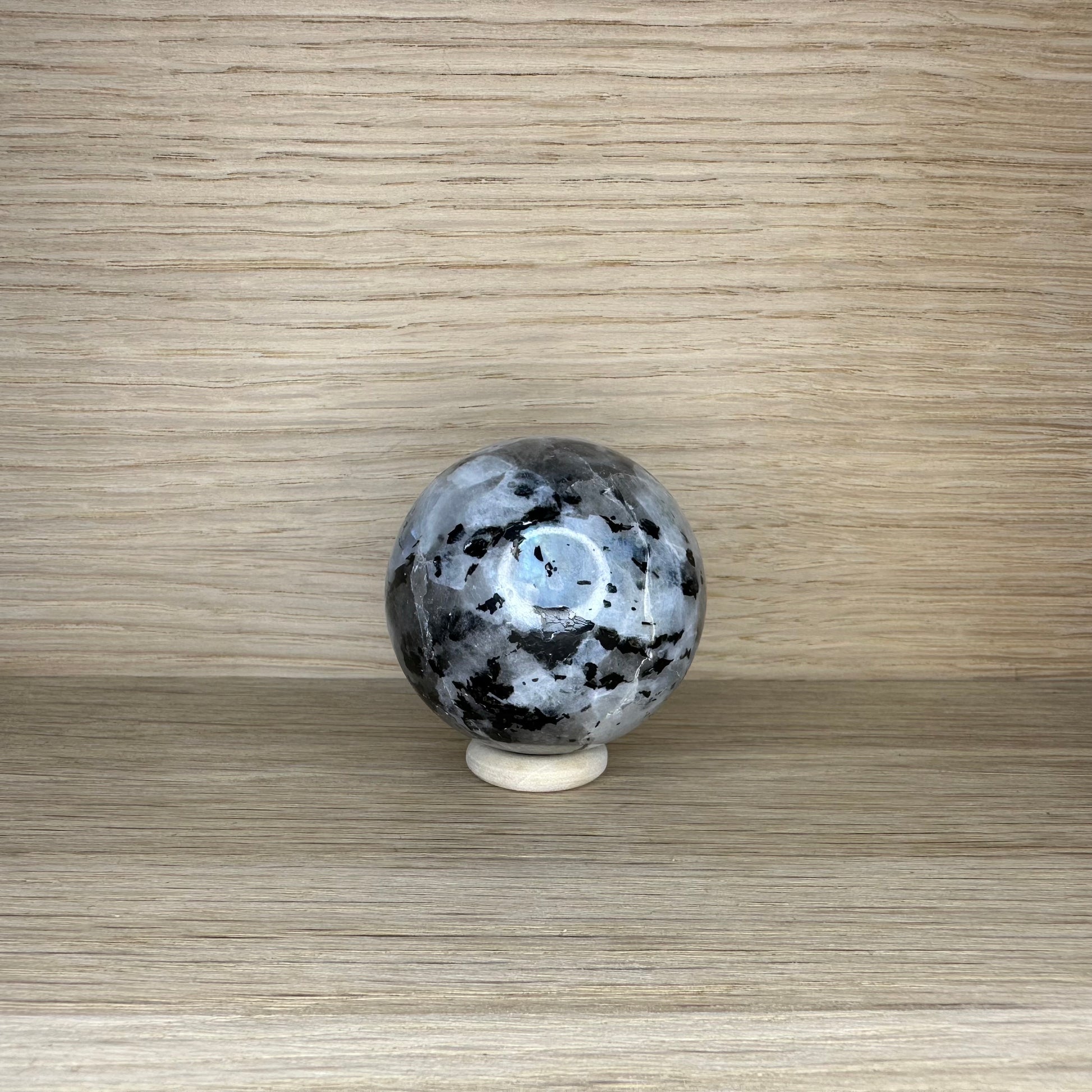 Magisk glans og farvespil: Regnbue månesten har en fortryllende skinnende overflade med blålige og flerfarvede reflekser, der glimter i lyset. Hver kugle er unik og udstråler sin egen blide, men kraftfulde energi, som spejler månens mystik og skønhed.