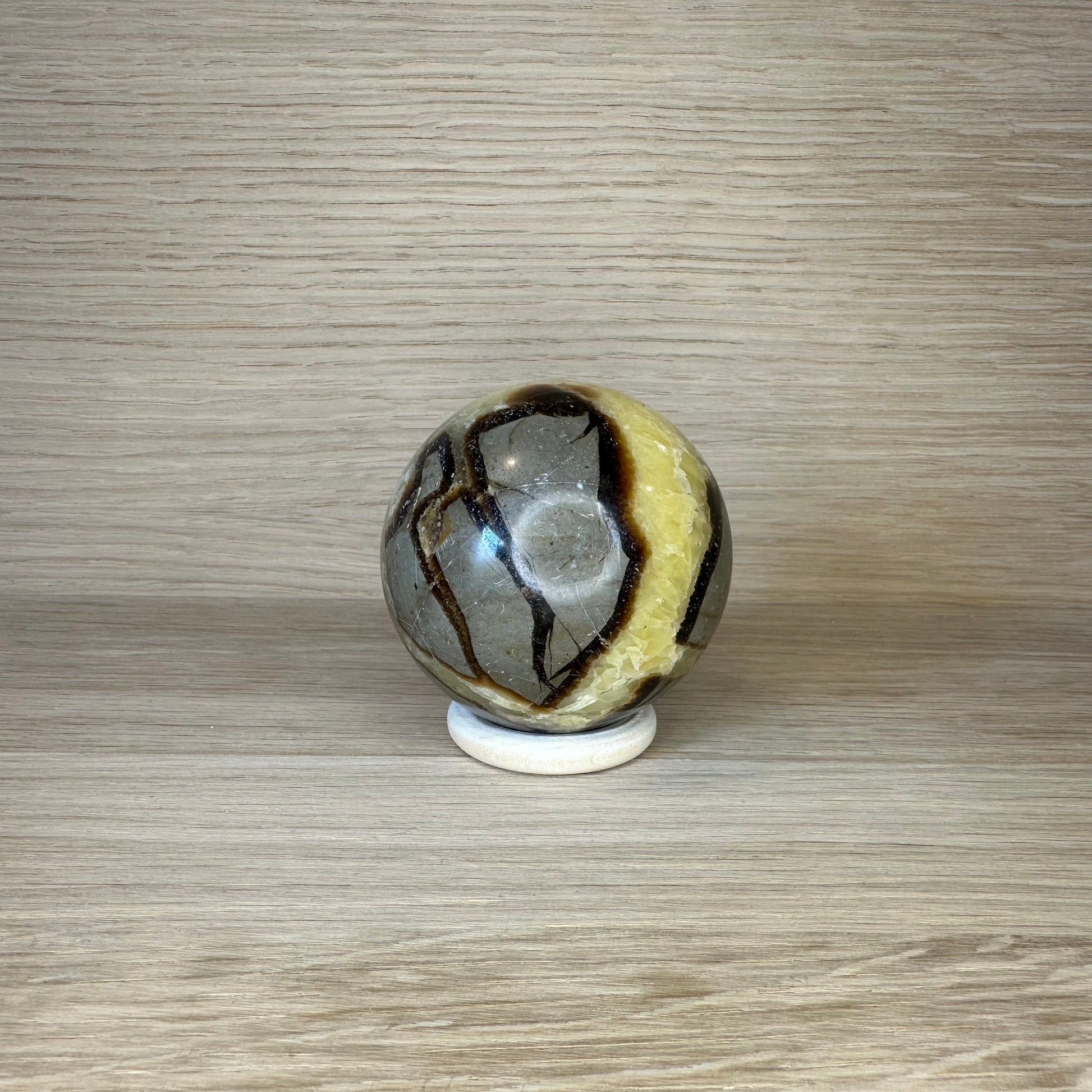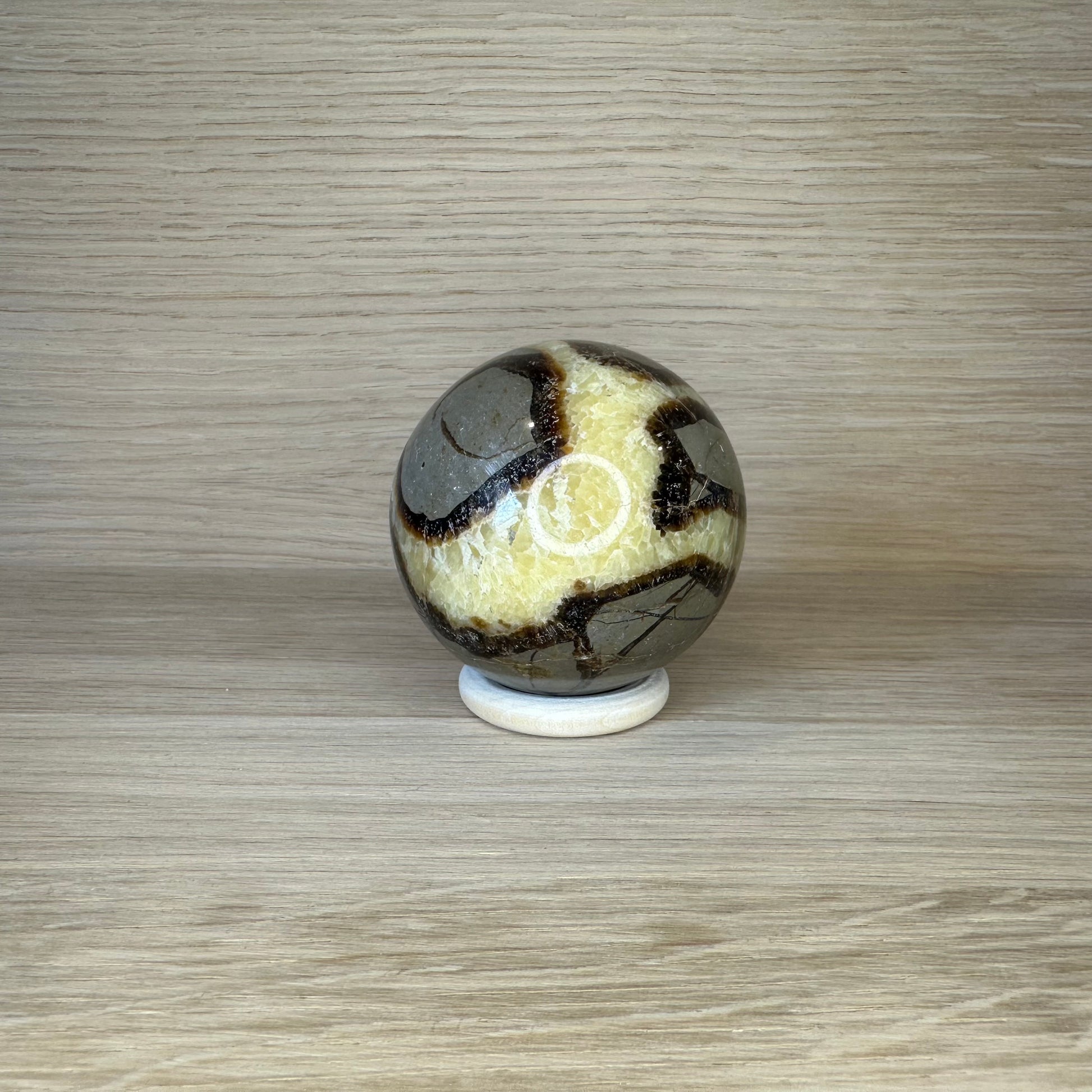 Visuelt udtryk: Denne kugle har de karakteristiske brudmønstre og farvespil, som gør Septarie så dragende – med gylden kalkspat, mørke aragonitlinjer og jordnære baggrundsfarver. Den fremstår næsten fossillignende, som om den bærer millioner af års historie i sig.