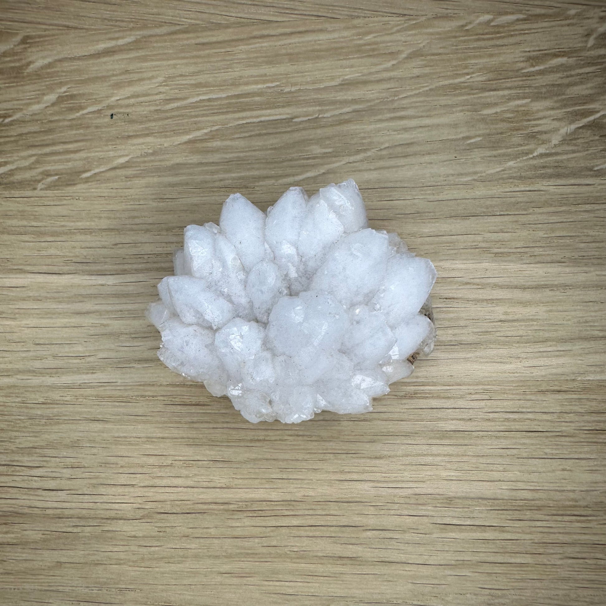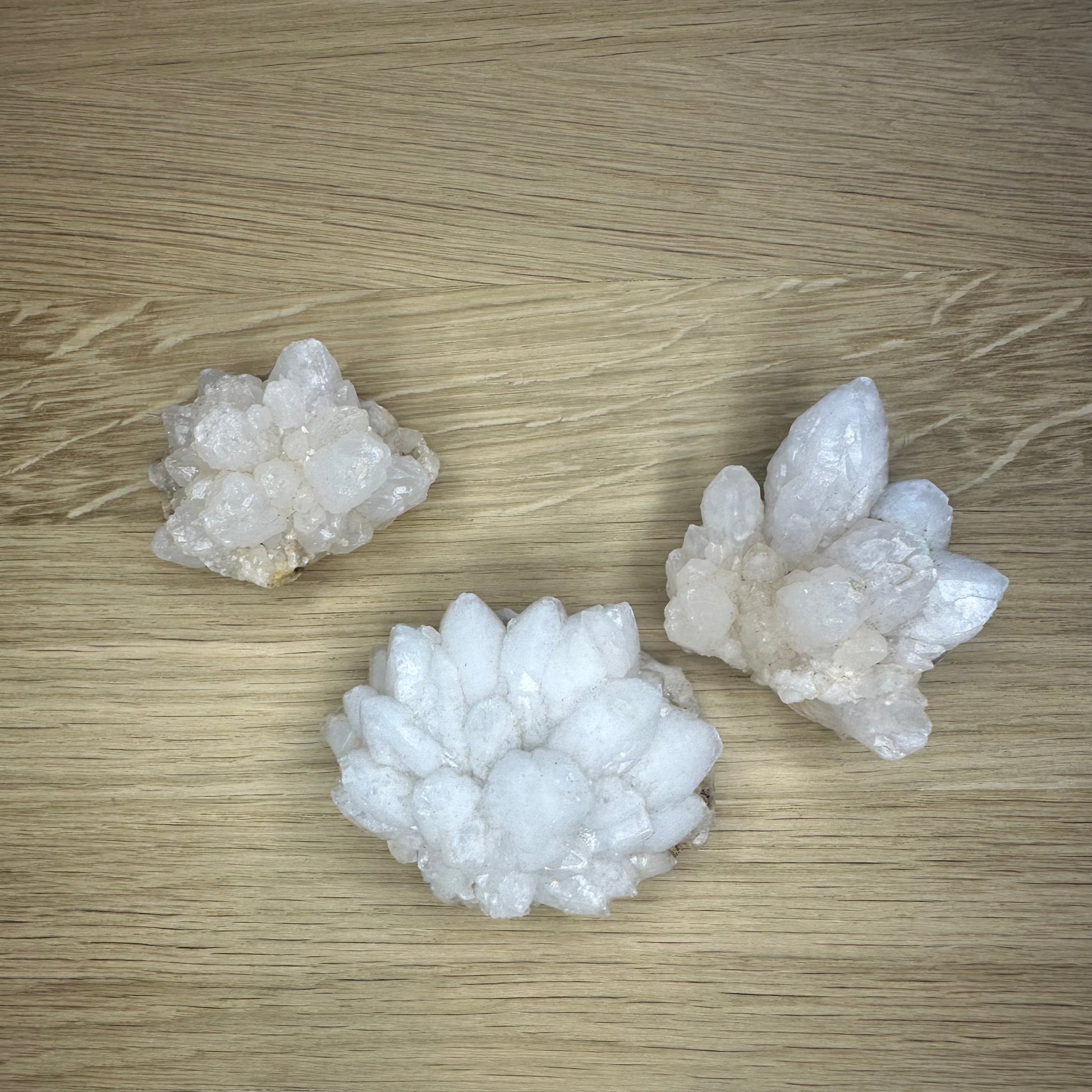 Disse unikke krystalklynger er lavet af snekvarts og stammer fra Smara i Vestlige Sahara-ørken, Marokko. Hver klynge er et naturens vidunder, hvor kompakte, snehvide krystaller danner smukke, uigennemsigtige formationer, der udstråler ren og stabil energi. Hvert stykke er helt unikt og leveres som et enkelt, udvalgt eksemplar.