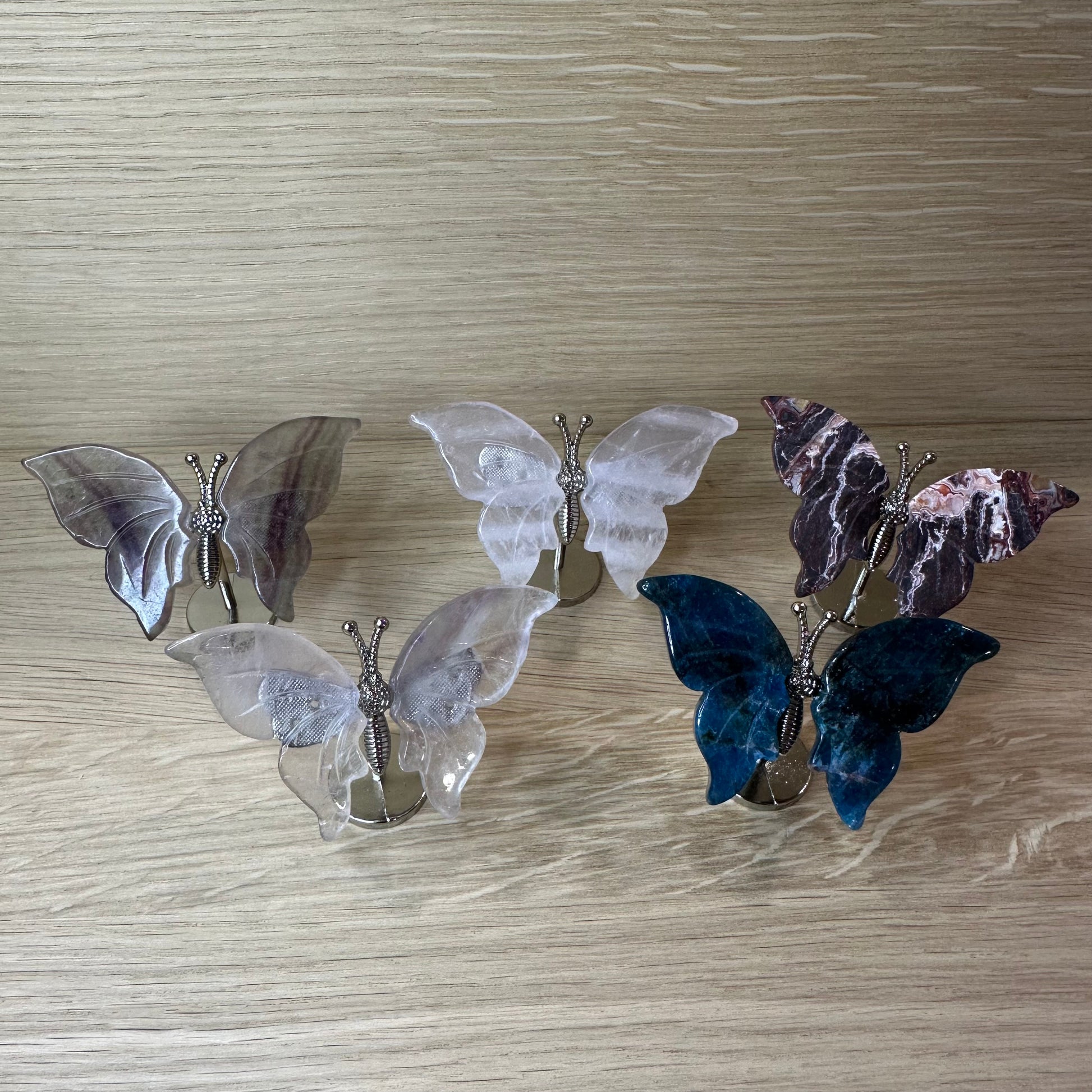 Bemærk: Stenene er natursten, og farve, glans og mønster varierer fra figur til figur. Hver sommerfugl er derfor unik – både visuelt og energetisk.