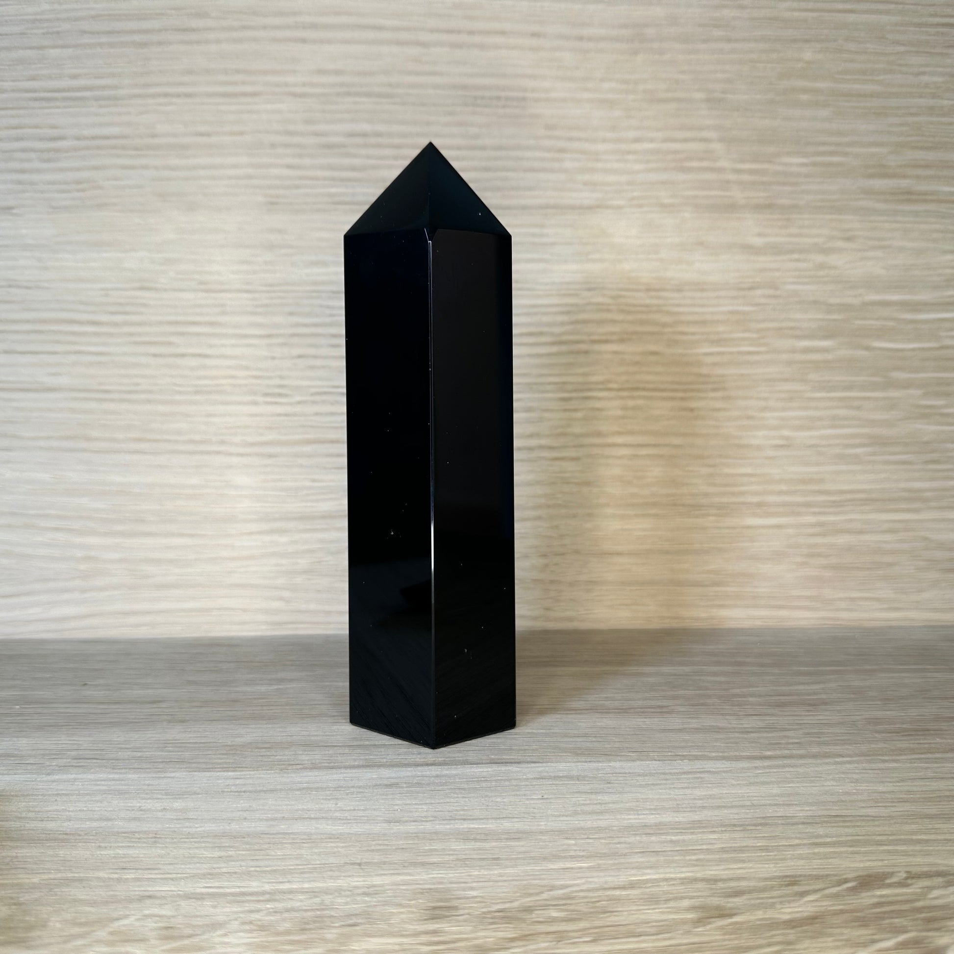 Dyb sort glans og spejllignende overflade: Obsidian har en intens sort farve og en naturlig, glaslignende glans, der både er elegant og kraftfuld. Dette tårn har en glat, poleret overflade, der nærmest fungerer som et spejl – perfekt til refleksion, skyggearbejde og meditation.