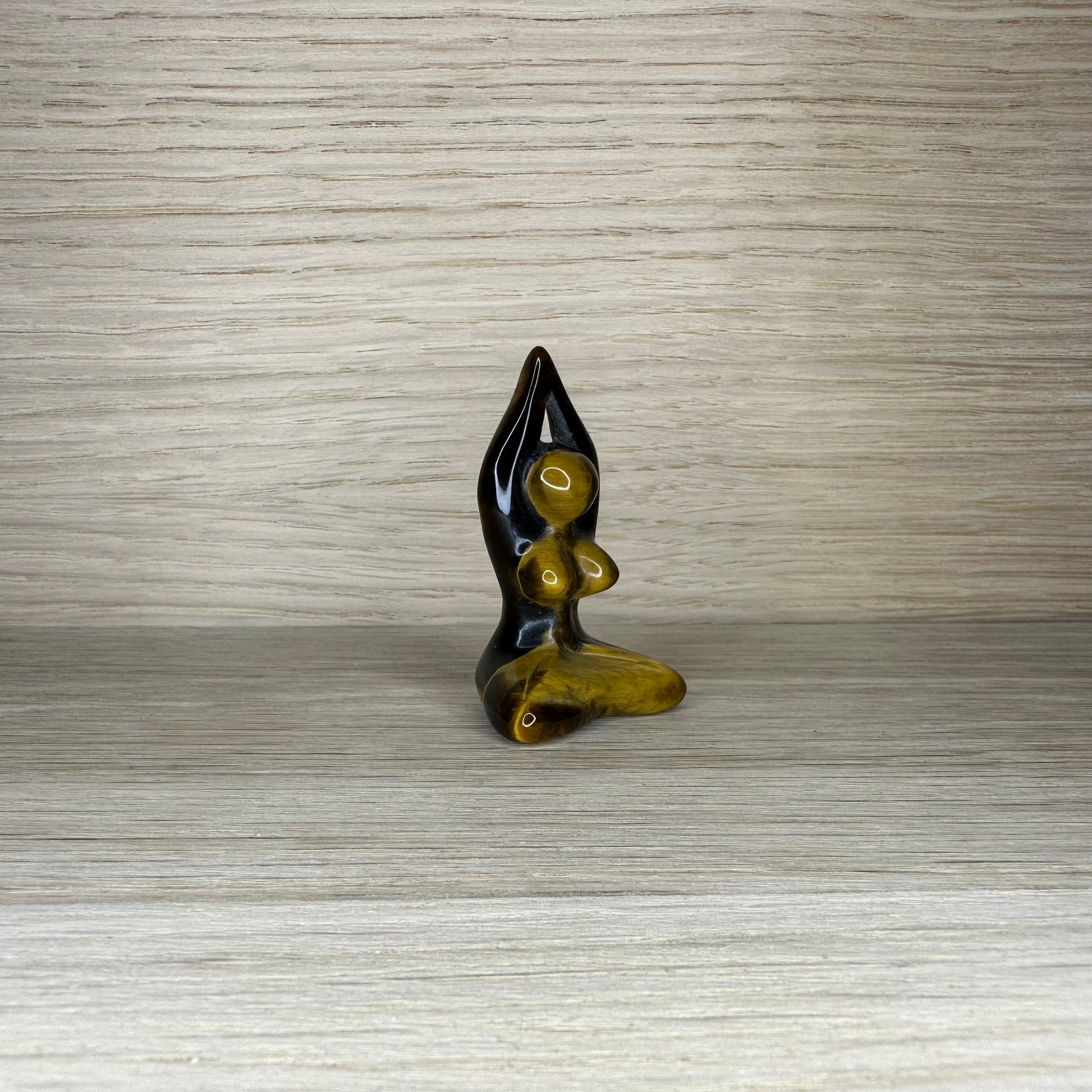 Denne Meditationsfigur i Tigerøje udstråler styrke, jordforbindelse og indre ro. Figuren forestiller en kvinde i en åben meditationsstilling – med knæene ud til siden og hænderne løftet over hovedet i en gestus, der symboliserer taknemmelighed, ro og forbindelse til det højere selv. Tigerøjets varme, gyldne glød bringer en energi af selvtillid, beskyttelse og personlig styrke ind i både sind og rum.