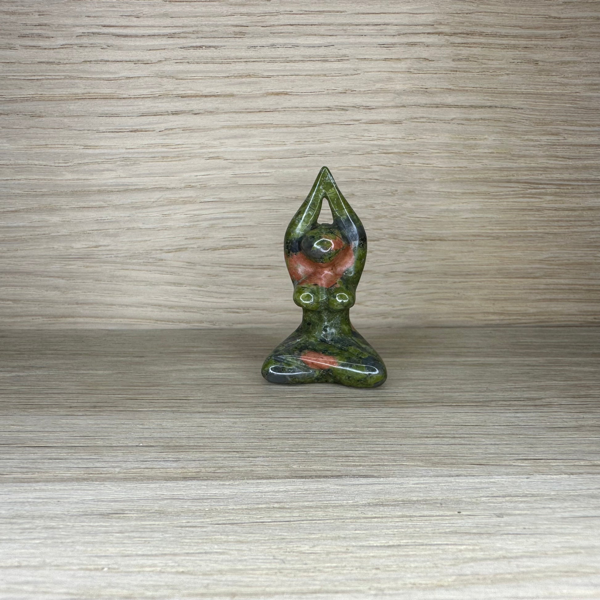 Denne Meditationsfigur i Unakit er et symbol på healing, jordforbindelse og indre transformation. Figuren forestiller en kvinde i en åben meditationsstilling – med bøjede knæ og løftede arme samlet over hovedet i en gestus, der udstråler indre ro, selvaccept og spirituel forbindelse. Udført i den nærende og hjertecentrerede Unakit bringer figuren en dyb, støttende energi ind i både sind, krop og rum.