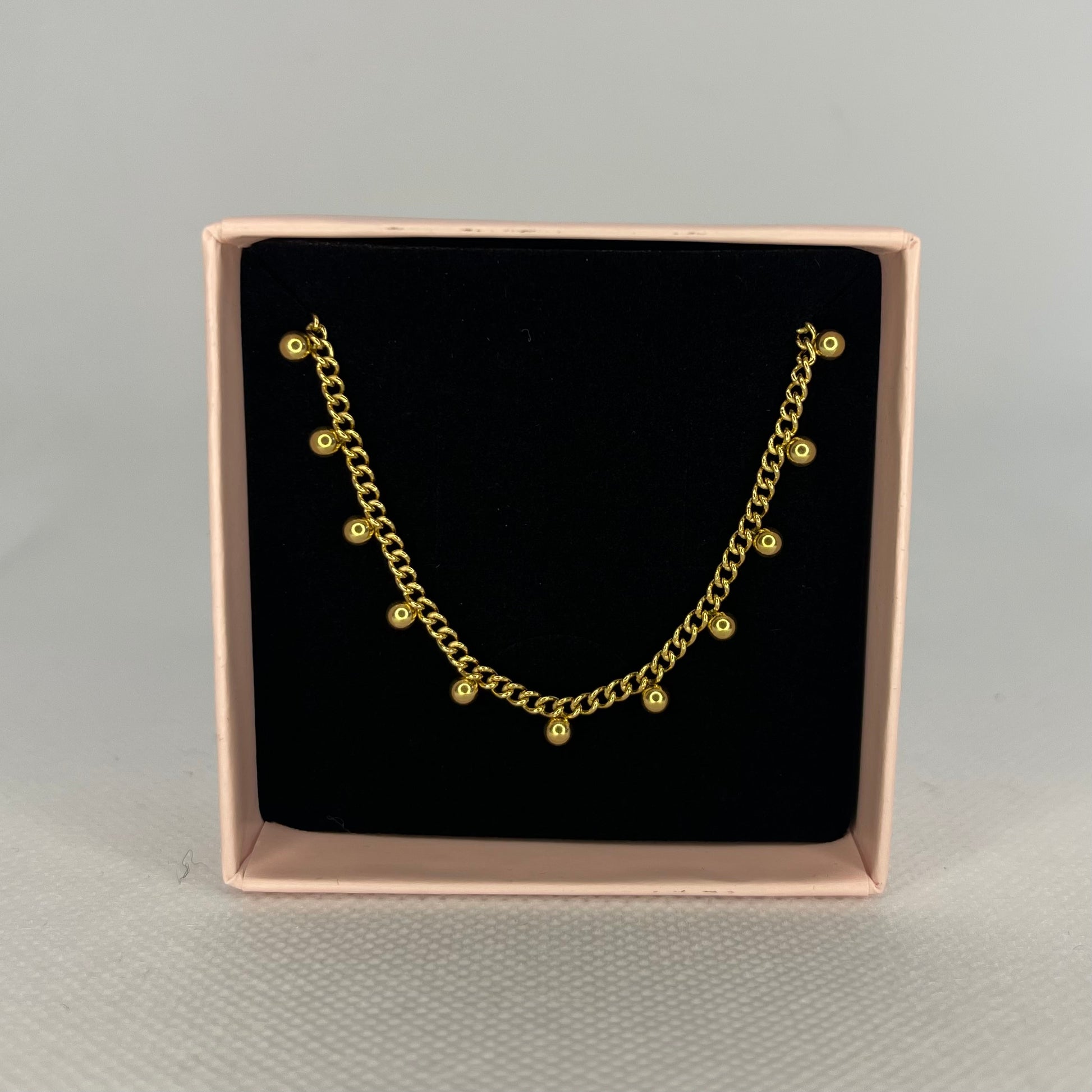 Vera halskæden er lavet af rustfrit stål og PVD belagt med 18 karat guld.